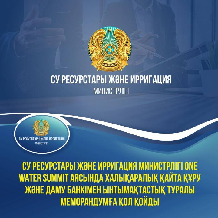 Су ресурстары және ирригация министрлігі Халықаралық Қайта Құру және Даму банкімен (ХҚҚДБ) ынтымақтастық туралы Меморандумға қол қойды. Қазақстан Республикасының Президенті Қасым-Жомарт Тоқаев пен Франция Президенті Эмманюэль Макронның қатысуымен Сауд Арабиясында өтіп жатқан One Water Summit халықаралық саммитінде құжатқа қол қойылды.Меморандум су ресурстарын басқару, су тасқыны мен құрғақшылық қаупін басқару, суарудың тиімділігін арттыру, сондай-ақ су ресурстарын есепке алу мен мониторингін цифрландыру бойынша тәжірибе мен озық әдіс-тәсілдерді алмасуды көздейді. Тараптар су ресурстарын басқару және инженерия саласында білімді тереңдету үшін бірлескен тренингтер, семинарлар, жұмыс кездесулері мен конференциялар ұйымдастыратын болады.Сондай-ақ, келісімде зерттеу, инновация мен технологиялар саласында да ынтымақтастық қарастырылған. Атап айтқанда, қашықтықтан зондтауды қолдана отырып дерек жинау бағытында серіктестік орнатылады.«Меморандум экологиялық жағдайды жақсарту және су ресурстарын басқару, соның ішінде Солтүстік Арал теңізі бойынша да маңызды іс-шараларды іске асыруға бағытталған. Құжат ең алдымен, Арал теңізі бассейнінде және оған жақын аймақта өмір сүру сапасын жақсартуға бағытталған бірлескен жобаларды әзірлеуді көздейді. Аралды сақтау мәселесінде шетелдік серіктестермен ынтымақтастық орнату маңызды рөл атқарады және министрлік бұл процеске халықаралық ұйымдар мен қаржы институттарын белсенді түрде тартуда»,– деді Су ресурстары және ирригация бірінші вице-министрі Болат Бекнияз.Ақпарат көзі : https://www.gov.kz/memleket/entities/water/press/news/details/895962
