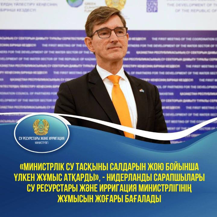 Нидерландының Қазақстандағы Төтенше және Өкілетті Елшісі Нико Схермерс Су ресурстары және ирригация министрлігінің су тасқыны салдарын жою іс-шараларына қатысты пікір білдірді. Елші су тасқынын болжау және су тасқынының алдын алу мәселесінде Қазақстан мен Нидерландының ынтымақтастығына жеке тоқталды.«Нидерланд сарапшыларының айтуынша, министрлік биыл үлкен жұмыс атқарды. Көптеген есептеулерді қолмен жасау керек болса да, нәтижелері өте дәл келді. Менің ойымша, біздің елдеріміз бірлесіп шешуі керек басты мәселе - үлкен аумақтарда есептеулер жүргізу. Климаттың өзгеруіне байланысты біз жаңа сын-қатерлерге тап болдық. Осы міндеттерді шешу үшін Нидерланды тарапы министрлікпен бірлесіп жұмыс істеуге дайын. Су ресурстары және ирригация министрлігі өте үлкен жұмыс істеп жатыр деп санаймын. Қазақстанда көптеген донорлық ұйымдар жұмыс істейді. Сол себепті Үйлестіру кеңесін құру министрліктің халықаралық қоғамдастықтың күш-жігерін біріктіру мен үйлестіруді байыпты қабылдағанын көрсетеді. Бұл өте маңызды»,– деді Нико Схермерс.Айта кетейік, осыған дейін Су ресурстары және ирригация министрлігі мен Дельфт су білім беру институты (IHE Delft) арасындағы меморандум аясында нидерландылық сарапшылар Астанада су тасқыны тәуекелдерін басқару бойынша екі мәрте семинар өткізген болатын.Еске салсақ, Қазақстанның су секторын дамыту жөніндегі әріптестердің Үйлестіру кеңесінің құрамына БҰҰ, халықаралық ұйымдар мен қаржы институттарының өкілдері, сондай-ақ шетелдік даму агенттіктерінің, дипломатиялық корпус пен бизнес өкілдері кіреді.Ақпарат көзі : https://www.gov.kz/memleket/entities/water/press/news/details/895155