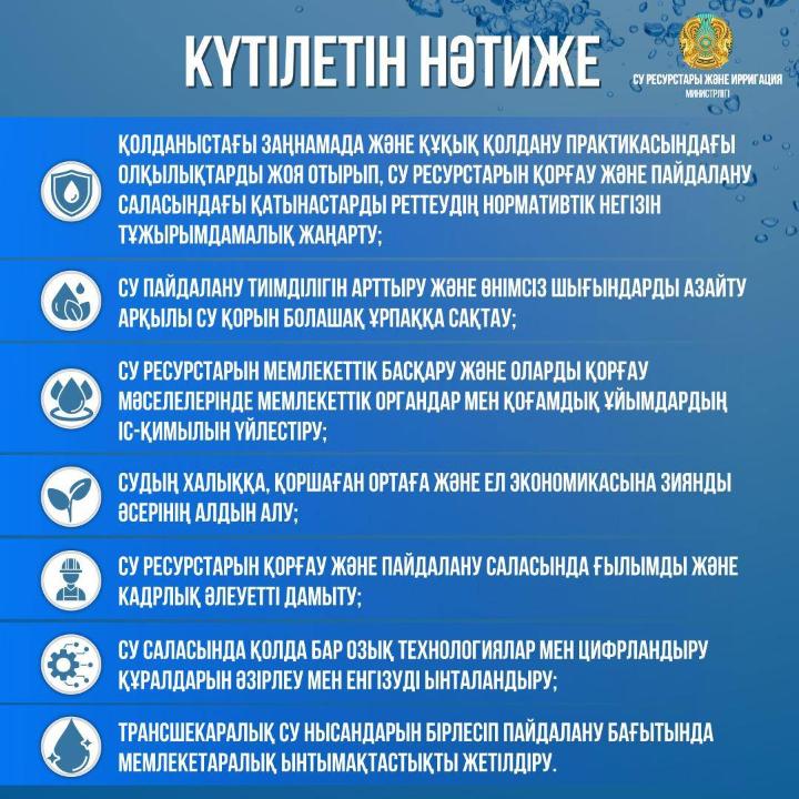 Жаңа Су кодексінің жобасы Президент Қасым-Жомарт Тоқаевтың тапсырмасы бойынша еліміздің су қауіпсіздігін қамтамасыз ету және болашақ ұрпақтың мүддесі үшін бірыңғай мемлекеттік су саясатын іске асырудың құқықтық негіздері мен тетіктерін жетілдіру мақсатында әзірленді. Заңнамалық өзгерістер су ресурстарын басқару тәсілдерін Қазақстанның су әлеуетін сақтауға басымдық беру жағына қарай қайта бағытталды.Су ресурстары және ирригация министрлігі кодекс жобасын әзірлеу барысында Австралия, Германия, Израиль, Канада, Өзбекстан және тағы да басқа мемлекеттердің тәжірибесі мен су ресурстары саласындағы заңнамасын зерттеді.Қолданыстағы су заңнамасының әлсіз жақтарын анықтау үшін өңірлерді аралап, сарапшылармен және ғылыми ұйымдармен бірнеше мәрте кеңес өткізді.Парламент Мәжілісінің депутаттары және тәуелсіз сарапшылардың қатысуымен жаңа Су кодексінің жобасын талқылау бойынша жұмыс тобы 37 отырыс өткізді.2003 ЖЫЛҒЫ ҚОЛДАНЫСТАҒЫ РЕДАКЦИЯДА:- 20 жылда 272 өзгеріс енгізілді- Көптеген нормалар декларативті немесе оларды жүзеге асыру механизмі қарастырылмаған- Кей нормалар бір-біріне логикалық тұрғыда сәйкес келмейді және қарама-қайшылықтар кездеседі- ГТҚ қауіпсіздігі, суару және дренаж, ауыз су және сумен қамтамасыз ету мәселелері шешілмегенСУ КОДЕКСІНІҢ ЖАҢА РЕДАКЦИЯСЫНДА:- Кодекс нормалары жүйеленді- Декларативті, қайталанатын нормалар алынып тасталды- Су кодексінің принциптері мен міндеттері оларды іске асыру тетіктерімен қоса айқындалды- ГТҚ қауіпсіздігі, суару және дренаж, ауыз су және сумен қамтамасыз ету мәселелері жеке бөлімдерге бөліндіЖАҢА СУ КОДЕКСІНІҢ БАСТЫ МАҚСАТЫ:1. Су пайдаланудың қауіпсіз деңгейіне қол жеткізу және оны сақтау2. Экономиканың тұрақты дамуын қамтамасыз ету3. Азаматтардың өмір сүру сапасын жақсарту және қоршаған ортаға ұқыпты қарау.НЕГІЗГІ ПРИНЦИПТЕР:1. Суды қоршаған ортаның ажырамас бөлігі, халықтың тіршілік әрекеті мен экономикалық дамуының негізі ретінде тану2. Мемлекеттің су ресурстарын пайдалану кезінде олардың экономикалық құндылығын тануы3. Жерүсті және жерасты су ресурстарын кешенді пайдалану4. Су үнемдеу5. Су қорын сақтау және пайдалану жөніндегі міндеттерді шешуге қоғам өкілдерін тарту6. Қазақстан Республикасы ратификациялаған халықаралық нормалар мен келісімшарттар негізінде трансшекаралық су ресурстарын пайдалануЖАҢА РЕДАКЦИЯДА:1. Мемлекет басшысының тапсырмасы бойынша елді мекендер мен нысандарды тасқын және еріген қар суынан қоғау және алдын алу іс-шаралары енгізілді2. Алғаш рет шағын көлдерді, өзендер мен тоғандарды, сондай-ақ мұздықтар мен сулы-батпақты аймақтарды қорғау жөнінде нормалар енгізілді3. Климаттың өзгеруіне бейімделуге және су үнемдеу принциптерін енгізуге баса назар аударылады4. Су ресурстарын басқарудағы үйлестіруді жақсарту үшін мемлекеттік және жергілікті атқарушы органдардың, жергілікті уәкілетті органдардың құзыреттерін мұқият реттейді5. Алғаш рет «экологиялық ағын» ұғымы енгізіледі, бұл – су объектілерінің экожүйелерін сақтау үшін судың ең төменгі рұқсат етілген деңгейі, сарқылудан және басқа да жағымсыз салдардан қорғайды6. Елді мекендердегі сумен жабдықтау, су бұру және гидротехникалық құрылыстардың қауіпсіздігіне ерекше назар аударылады7. Тазартылған ағынды суларды қайта пайдалануға басымдық беріледі8. Бассейндік инспекцияла