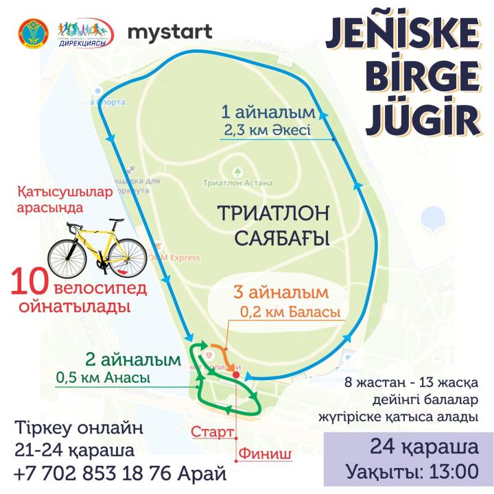 Елорданың Триатлон саябағында 24 қараша күні Jeniske birge jugir отбасылық жарысы өтеді, деп хабарлайды қала әкімдігінің ресми сайты.Әрбір қатысушы отбасы жүгіретін жалпы қашықтық үш деңгей бойынша өтеді: 2 км 300 м – әкесі, 0,5 км – анасы, 0,2 км – балалар.Жарысқа ата-анасының біреуі болмаған жағдайда жақын туыстары қатыса алады.Алғашқы үш орын үшін әкелер сыйлық ретінде теледидар алады. Аналар арасында бірінші орын үшін микротолқынды пеш, екінші орын үшін – шаңсорғыш, үшінші орын үшін – термопот беріледі.Балалар арасында бірінші болып жеткенге – планшет, екінші орынға – смартфон, үшінші орынға ақылды сағат беріледі.Жас санаттары (балалар):- 8-9 жас;- 10-11 жас;- 12-13 жас.Жарысқа қатысуға ниет білдірушілерді тіркеу 21-24 қараша аралығында онлайн режимінде өтеді.Жарыс күні басталғанға дейін тіркелуге болады. Жарыстың басталуы 24 қараша күні сағат 13:00-де.Мәреде қатысушылардың бәріне естелік медальдар беріледі. Іс-шара соңында 10 велосипед ойналады.Ақпарат көзі : https://www.gov.kz/memleket/entities/astana/press/news/details/887907