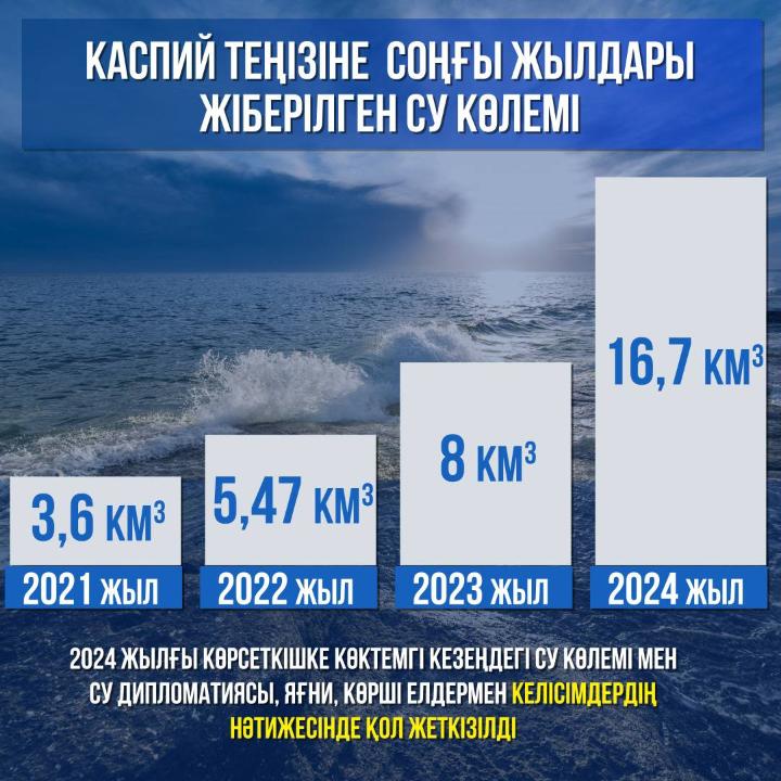 Каспий теңізіне соңғы жылдары жіберілген су көлемі:2021 жыл − 3,6 км³2022 жыл − 5,47 км³2023 жыл−8 км³2024 жыл−16,7 км³2024 жылғы көрсеткішке көктемгі кезеңдегі су көлемі мен су дипломатиясы, яғни, көрші елдермен келісімдердің нәтижесінде қол жеткізілді.Ақпарат көзі : https://www.gov.kz/memleket/entities/water/press/news/details/880358