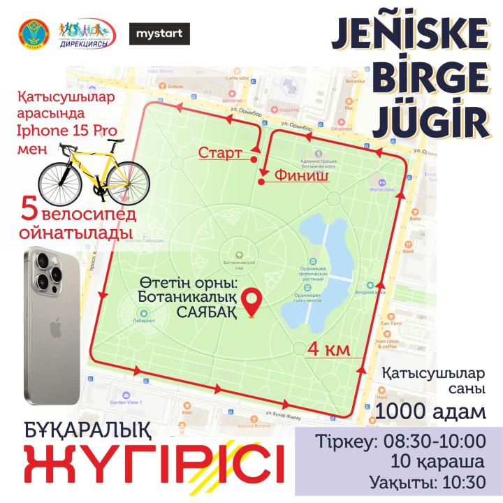 Астана қаласында 10 қараша күні Jeniske birge jugir бұқаралық жүгірісі өтеді, деп хабарлайды елорда әкімдігінің ресми сайты.Қала әкімдігінің ұйытқы болуымен өтетін спорттық іс-шара Ботаникалық саябақта өтеді.Жарыстың жалпы қашықтығы – 4 км. Жарысқа қатысуға ниет білдірушілерді тіркеу сағат 08:30-10:00 аралығында өтеді. Ал іс-шара тиісінше сағат 10:00-де өтеді. Тіркелу тегін. Спорттық іс-шараға 1000 адамға дейін қатыса алады.Қатысушыларға финиш алаңында естелік медальдары беріледі.Ал ерекше айта кетерлігі, қатысушылар арасында iPhone 15Pro және 5 велосипед ойнатылады.Ақпарат көзі : https://www.gov.kz/memleket/entities/astana/press/news/details/878145