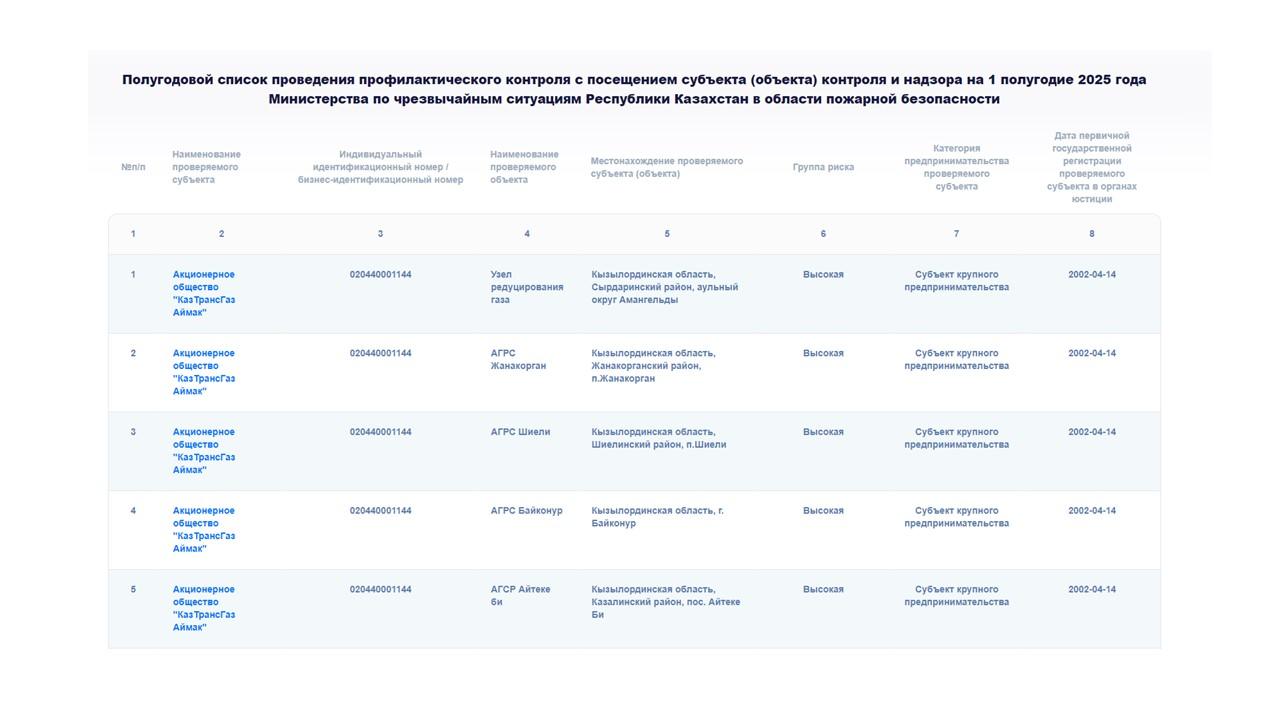 Тәуекелдерді басқарудың автоматтандырылған жүйесі мемлекеттік өрт бақылау және қадағалау жүргізу үшін тәуекелі жоғары объектілердің тізімін қалыптастырды.Өрт қауіпсіздігі саласындағы 2025 жылғы 1 жартыжылдыққа бақылау және қадағалау субъектісіне (объектісіне) барумен профилактикалық бақылау жүргізудің цифрлық тізімі «электрондық үкімет» порталында орналастырылған.Сондай-ақ, өрт қауіпсіздігі саласындағы 2025 жылға арналған бақылау және қадағалау субъектісінің (объектісінің) біліктілік талаптарына сәйкестігіне тексеру жүргізу кестесі жарияланды.Бұл тексерулердің мақсаты объектілердің азаматтық қорғау саласындағы мемлекеттік бақылау мен қадағалаудың маңызды бөлігі ретінде өрт қауіпсіздігінің белгіленген талаптарына сәйкестігін қамтамасыз ету болып табылады.Толық тізіммен және кестемен сілтеме бойынша танысуға болады: rchl.govtec.kz.Естеріңізге сала кетейік, өрт қауіпсіздігі саласындағы критерийлерге сәйкес бақылау және қадағалау объектілері үш тәуекел дәрежесіне бөлінеді – жоғары, орташа және төмен.Тәуекел дәрежесі жоғары және орташа объектілердің профилактикалық бақылауы кестелер мен жартыжылдық тізімдер негізінде жүргізіледі.Жоспардан тыс тексерулерді қоспағанда, өрт қауіпсіздігі талаптарының сақталуына тәуекел дәрежесі төмен объектілер тексерілмейді.Ақпарат көзі : https://www.gov.kz/memleket/entities/emer/press/news/details/876840