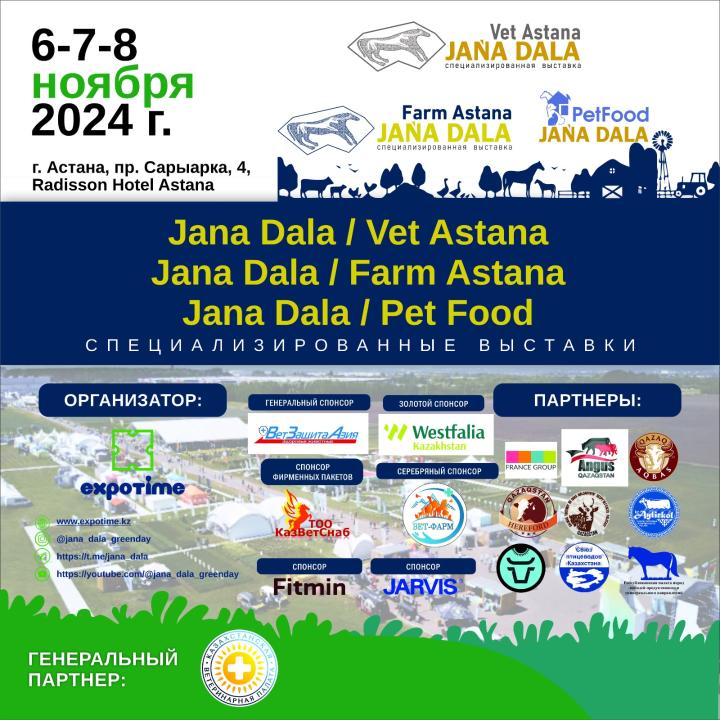 Астанада 6-8 қарашада мал шаруашылығы мен құс шаруашылығы бойынша «Jańa Dala/Farm Astana 2024» халықаралық көрмесі және жемшөп пен ветеринария бойынша «Jańa Dala/Vet Astana 2024» халықаралық көрмесі өтеді.Оған ҚР АШМ өкілдері, Парламент Мәжілісінің депутаттары, отандық даму институттарының, салалық қоғамдық ұйымдар мен бірлестіктердің сарапшылары қатысады.Көрменің мақсаты - қазақстандық мал шаруашылығы мен құс шаруашылығы кәсіпорындарына тәжірибе және өндіріс технологияларымен алмасуға арналған платформаны қамтамасыз ету арқылы бизнесті тиімді жүргізуге жәрдемдесу.Басты назарда - Қазақстандағы мал дәрігерлігінің жай-күйі, жемшөп өндірісі мәселелері.Онда мал шаруашылығы мен құс шаруашылығы саласындағы қазіргі заманғы ұсыныстар, жемшөп өндірісі, ветеринария, ірі тауарлы сүт өндірісі индустриясындағы соңғы әзірлемелер ұсынылатын болады.Заманауи аграрлық технологияларды жеткізуші компаниялар үшін көрмелер ірі ұйымдармен, сондай-ақ шағын шаруашылықтармен және жануарлар иелерімен іскерлік байланыстар үшін тиімді салалық алаңдар болады. Ақпарат көзі : https://www.gov.kz/memleket/entities/moa/press/news/details/875478