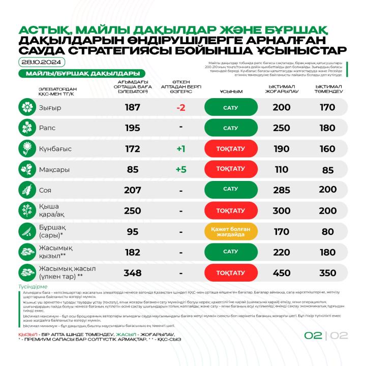 Дәнді дақылдар3-сыныпты бидай бағасына аздап төмендетілген түзету жүргізілді. Сауда баяу.элеватардан, ҚҚС-мен, тг/кгАғымдағы орташа баға (элеватор)ӨзгерістерҰсынымЫқтимал ең жоғарыЫқтимал ең төменгіжұмсақ бидай 3 сыныпты, 28 клк +105-1САТУ14590жұмсақ бидай 3 сыныпты, 25 клк дейін80-7САТУ9570жұмсақ бидай 3 сыныпты, 23 клк дейін69-9САТУ8560жұмсақ бидай 4 сыныпты, 20 клк дейін61,4-ҚАЖЕТТІЛІГІНЕ ҚАРАЙ8050жұмсақ бидай 5 сыныпты, 17клк дейін52-САТУ6535арпа 2 сыныпты50-САТУ6035Дурум (прот 14+)85-ҚАЖЕТТІЛІГІНЕ ҚАРАЙ12070Дурум (прот 15+)104-ТОҚТАТУ15090 Арпа салыстырмалы түрде белсенді түрде сатылады. Трейдерлердің бірі Ақмола облысында ҚҚС – пен, ҚҚС-сыз 45 мың теңге/тоннадан арпа сатып алғаны туралы хабарлады.қызыл – бір апта ішінде төмендеу, жасыл-жоғарылау Майлы/Бұршақ ДақылдарыМайлы дақылдар тобында рапс бағасы сақталады, бірақ нарық қатысушылары 200-210 мың теңге/тоннаға дейін қымбаттайды деп болжайды. Зығырдың бағасы төмендей береді. Күнбағыс бағасы қалыптасуды жалғастыруда және Ресейде егіннің төмендеуіне байланысты лайықты болады деп күтілуде.элеватардан, ҚҚС-мен, тг/кгАғымдағы бағаӨзгерісҰсынымЫқтимал ең жоғарыЫқтимал ең төменгіЗығыр187-2САТУ200170Рапс195-САТУ250180Күнбағыс172+1ТОҚТАТУ190160Мақсары85+5ТОҚТАТУ11085Соя207-САТУ285200Қыша қара/ақ250-ТОҚТАТУ300200Бұршақ (сары)*95-ҚАЖЕТТІЛІГІНЕ ҚАРАЙ17080Жасымық (қызыл)**182-САТУ220180Жасымық жасыл (үлкен көлемде) **348-ТОҚТАТУ450350* - премиум сапасы бар солтүстік аймақтар, * * - ҚҚС-сыз жаңа өнім курсивпен бөлінді Түсіндірме:Ағымдағы баға-келісімшарттар жасалатын элеваторда немесе вагонда Қазақстан ішіндегі ҚҚС-пен орташа өлшенген бағалар. Бағалар аймаққа, сапа көрсеткіштеріне, жеткізу шарттарына байланысты өзгеруі мүмкін.Ұсыныстар: стоп-сауданы неғұрлым қолайлы бағаларға дейін тоқтата тұру ұсынылады; қажет болған жағдайда сату (техникалық, қаржылық); сату – тауарды сату ұсынылады, өйткені жақын арада қолайлы перспективалар күтілмейді.Мүмкін макс-бұл нақты брошюраның авторлары ағымдағы сауда маусымында бағаға жетуі мүмкін сияқты көрінетін бағаның жоғарғы шегі. Бұл пікір түпкілікті емес және жағдайға байланысты өзгеруі мүмкін.Мүмкін мин-бұл ағымдағы маусымда Мәдениет қол жеткізе алатын бағаның төменгі шегі.Ақпарат көзі : https://www.gov.kz/memleket/entities/moa/press/news/details/872754