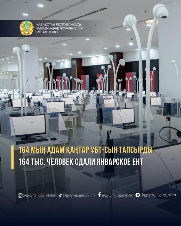 164 МЫҢ АДАМ ҚАҢТАР ҰБТ-СЫН ТАПСЫРДЫ164 мыңға жуық адам қаңтар айындағы ҰБТ-ны тапсырды. Оның ішінде талапкерлердің 76,81%-ы қазақ тілінде, 23,14%-ы орыс тілінде, 89 адам ағылшын тілінде тестілеуден өтті.ҰБТ-да шекті балды 70,35%-ға жуық талапкер жинады. Орташа балға келетін болсақ, ол 65,81 балды құрады. Ең жоғары балл – 139. Жалпы 186 талапкер 130-дан жоғары балл жинады.Тестке қатысушылардың басым бөлігі «Математика-Физика» комбинацияларын таңдаған, атап айтқанда, 17,5%-ы тапсырды. «Биология-Химия» пәндерін 17,27% таңдаған. Сондай-ақ топ-3 қатарына талапкерлердің 10,29% таңдаған «Математика-Информатика» комбинациясы кірді. Ең аз таңдалған комбинация – «Химия-Физика», оны 197 адам тапсырған.2025 жылғы қаңтар ҰБТ-сының қорытындысы бойынша талапкерлер «Оқу сауаттылығы» пәнін жоғары деңгейде тапсырды. Орташа есеппен сұрақтардың 75,43%-ына дұрыс жауап берілген. Ал «Физиканы» тапсырған талапкерлердің тек 32,32% тапсырманы дұрыс орындаған, олар үшін «Электромагниттік индукция» тақырыбы қиын болды. Осылайша, ҰБТ нәтижелері бойынша Ұлттық тестілеу орталығы тек сандар емес, сонымен қатар тақырыптар бойынша егжей-тегжейлі талдауды да ұсынады.Ерекше білім беру қажеттіліктері бар оқуға түсушілер үшін қолайлы жағдай жасаудың арқасында қаңтар ҰБТ-сына 392 талапкер қатысқанын айта кеткен жөн.ҰБТ өткізу барысында 197 ереже бұзушылық анықталған. Оның ішінде 101 талапкер смартфон және шпаргалка сияқты тыйым салынған заттарды алып өту әрекеті салдарынан тест тапсыру мүмкіндігінен айырылды, ал тестілеу кезінде ережелерді бұзғаны үшін аудиториядан 96 адам шығарылды. Өзге тұлғалар анықталған жоқ.Талапкерлер тестілеу аяқталғаннан кейін 30 минут ішінде апелляцияға бере алды. Бұл жолы 14 мыңнан астам өтініш қабылданды, олардың ішінде 10 өтініш қанағаттандырылды. Республикалық комиссия жұмысын аяқтады, талапкерлердің сертификаттары жеке кабинетте қолжетімді. Айта кетсек, 2025 жылғы ҰБТ аяқталғаннан кейін күнтізбелік жылдың 31 қазанына дейін тестілеудің бейнежазбаларына талдау жүргізіледі. Тыйым салынған заттарды пайдалану немесе ережелерді бұзу фактілері анықталған жағдайда түсушінің ҰБТ нәтижелері жойылады.Естеріңізге сала кетсек, қаңтардағы ҰБТ-ға шартты түрде ақылы негізде күндізгі оқу нысаны бойынша жоғары оқу орындарына қабылданған, жазғы ҰБТ нәтижелері бойынша шекті балл жинамағандар, шығармашылық ББТ-дан басқа дайындық бағыттарына, педагогикалық бағытқа ақылы негізде ауысқысы келетіндер, сондай-ақ мектеп бітіретін түлектер жоғары оқу орындарына ақылы негізде түсу үшін қатысады. ҚР ҒЖБМ Ұлттық тестілеу орталығыАқпарат көзі : https://www.gov.kz/memleket/entities/sci/press/news/details/936542