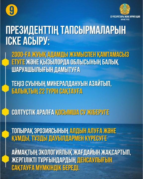 «Арал теңізінің құрғап, шөлге айналуы – алаңдатарлық мәселе. Экологиялық апатқа ұшыраған аймақты оңалту керек. Бұған қоса, трансшекаралық өзендердің су қорын тиімді пайдалану қажет. Ол үшін су үнемдеу технологияларын кеңінен қолдану керек», - деді Қазақстан Республикасының Президенті Қасым-Жомарт Тоқаев.2024 жылдың қазанынан осы жылдың қаңтарына дейін Солтүстік Арал теңізіне 1 миллиард текше метр су жіберілді. Бұл жоспарланған көлемнен 100 миллион текшее метрге артық. Орталық Азия елдерімен қол жеткізген келісімдерінің нәтижесінде 2025 жылғы наурыз айының соңына дейін Солтүстік Аралға жіберілген судың жалпы көлемі 1,6 млрд текше метрге жетеді.Бүгінгі таңда Солтүстік Арал теңізіндегі судың жалпы көлемі - 22,1 млрд текше метр. 2022 жылдың басында 18,9 млрд текше метр болды. 2025 жылдың соңына қарай теңіздегі су көлемі 23,4 млрд текшее метрге дейін жетеді деп күтілуде.Солтүстік Арал теңізінің ауданы да ұлғаюда. Бүгінгі таңда ол 3065 шаршы шақырымға жетті. Бұл 2022 жылдың басындағы көрсеткіштен 111 шаршы шақырымға көп.Солтүстік Арал теңізінің ауданы мен көлемінің ұлғаюы судың минералдануың азайтуға және балықтың 22 түрінің популяциясын қалпына келтіруге мүмкіндік берді. Жыл сайынғы балық аулау көлемі 8 мың тоннаға жетті.«Көкарал бөгетін сақтау және Сырдария өзені сағаларын қалпына келтіру» жобасы аяқталуға жақын. Бүгінгі таңда «Тәуір» қорғаныс бөгетін салу, Қарашаланкөлі мен Сырдария өзені арасындағы екі учаскедегі бөгеттер мен «Қарашалан-1» каналын және оның бас құрылысын реконструкциялау жұмысы аяқталды. Жыл соңына дейін Солтүстік Арал теңізін Үлкен Аралдан бөлетін Көкарал бөгетін қайта жаңарту жұмысын аяқтау жоспарланып отыр. Жобаны іске асыру Солтүстік Аралдың сақталуына және судың тұздылығын төмендетуге ықпал етеді.Қызылорда облысының күріш алқаптарын лазерлік жоспарлаушымен тегістеу және су үнемдеу технологияларын пайдалану шамамен 200 млн текше метр су үнемдеп, оны Солтүстік Аралға жіберуге мүмкіндік берді. 55 мың гектар күріш алқабы лазерлік жоспарлаушының көмегімен тегістелді, бұл орташа өнімділікті гектарынан 40-55 центнерден 70-80 центнерге дейін арттыруға септігін тигізді.Су үнемдеу технологияларын енгізуді ынталандыру үшін шаруалардың инфрақұрылым жүргізу, су үнемдеу жүйелерін сатып алу және орнату шығындарын субсидиялау мөлшері 50%-дан 80%-ға дейін ұлғайтылды. Су үнемдеу жүйелерін пайдаланатын дихандар үшін су армалысуға субсидия мөлшері тарифке байланысты 85%-ға дейін ұлғайтылды.Арал теңізі бассейніндегі аймақты оңалту мақсатында көгалдандыру жұмысы жалғасып жатыр. Бүгінде Үлкен Арал теңізінің тартылған аумағында 4,4 млн көшет отырғызылды.2021-2024 жылдар аралығында 475 мың гектар жерге тұқым мен көшет отырғызылды. Биыл 428 мың гектарда көгалдандыру жұмыстарын жүргізу жоспарланған. Осының нәтижесінде 2025 жылдың соңына қарай Арал теңізі табанын көгалдандырудың жалпы көлемі 1,1 млн гектарға жетуі тиіс.Айта кету керек, 2024 жылдың 1 қаңтарынан бастапа Халықаралық Аралды құтқару қорына төрағалық ету кезегі Қазақстан Республикасына өтті. Мемлекет басшысы Қасым-Жомарт Тоқаев 2026 жылдың соңына дейін ХАҚҚ Президенті болып сайланды. Қазақстанның 2024-2026 жылдар аралығындағы төрағалығы кезеңінде ХАҚҚ Атқару комитетінің жұмыс жоспары бекітілді. Құжат 10 түрлі бағыт бойынша 40-қа жуық іс-шараны қамтиды.Президенттің тапсырмаларын іск
