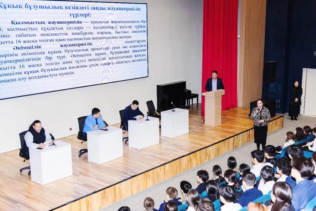 №101 орта мектепте өткен дәрісте тәрбие, отбасы құндылығы, кәмелет жасқа толмағандар арасындағы құқықбұзушылықтың себеп-салдары, оның алдын алу бойынша қабылданған шаралар, балалар арасындағы суицид, түнгі уақытта жалғыз қыдыру, ойын-сауық орындарына бару, қылмыс жасау және басқа да заңсыз әрекеттердің салдары, әлеуметтік желілердегі құқықбұзушылықты насихаттайтын ақпараттардың жастардың дамуына кері әсер ететіні туралы және т.б. өзекті мәселелер қамтылды.