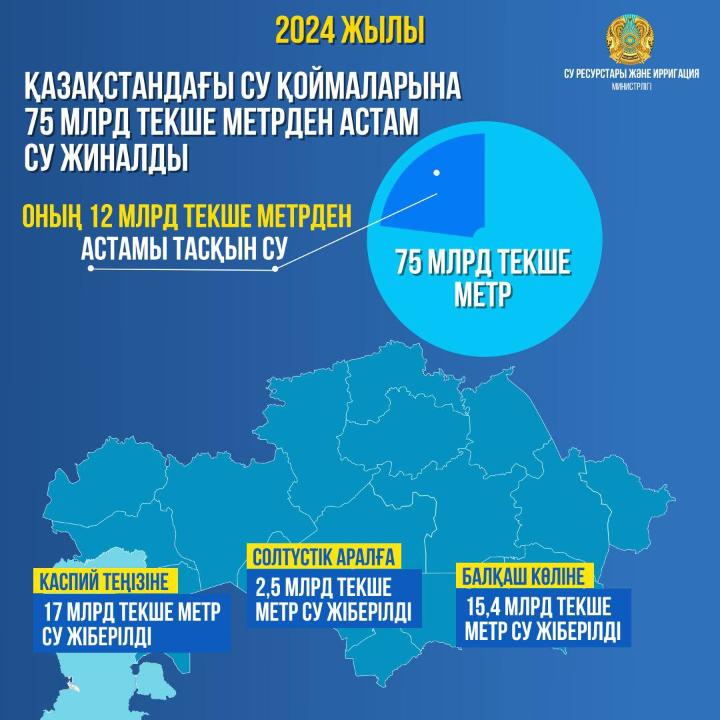 2024 жылы Қазақстандағы су қоймаларына 75 млрд текше метрден астам су жиналды. Оның 12 млрд текше метрден астамы тасқын су.