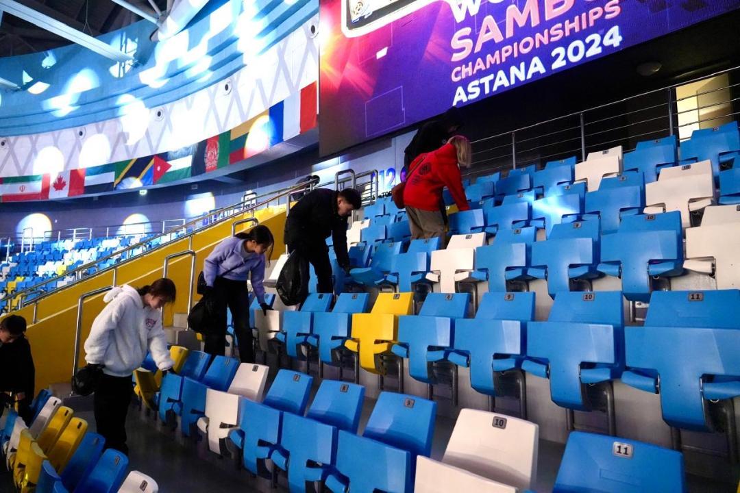Ж.Үшкемпіров атындағы Жекпе-жек сарайында самбодан әлем чемпионаты аяқталғаннан кейін жанкүйерлер трибунадағы қоқысты жинап, жұрттың ыстық ықыласына бөлінді, деп хабарлайды әкімдіктің ресми сайты.