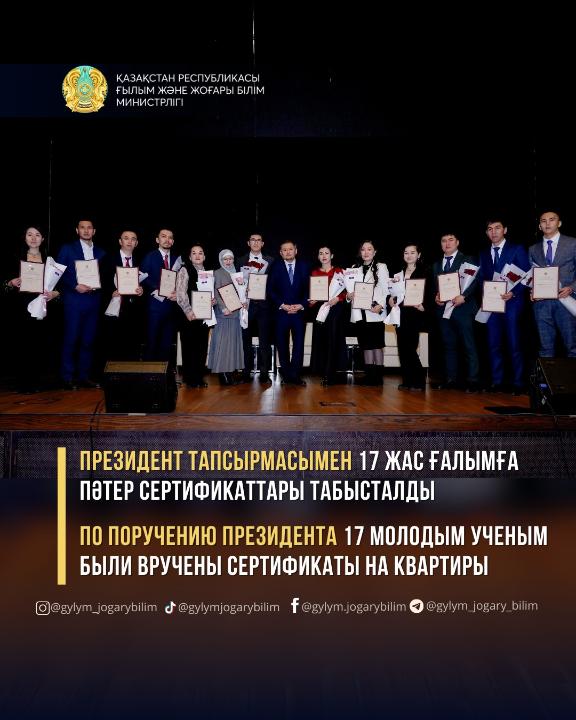 7 ақпанда ҚР Ғылым және жоғары білім министрлігінің кеңейтілген алқа отырысында Мемлекет басшысының тапсырмасы бойынша Ғылым және жоғары білім министрі Саясат Нұрбек 17 жас ғалымға пәтер сертификаттарын салтанатты түрде табыстады.
