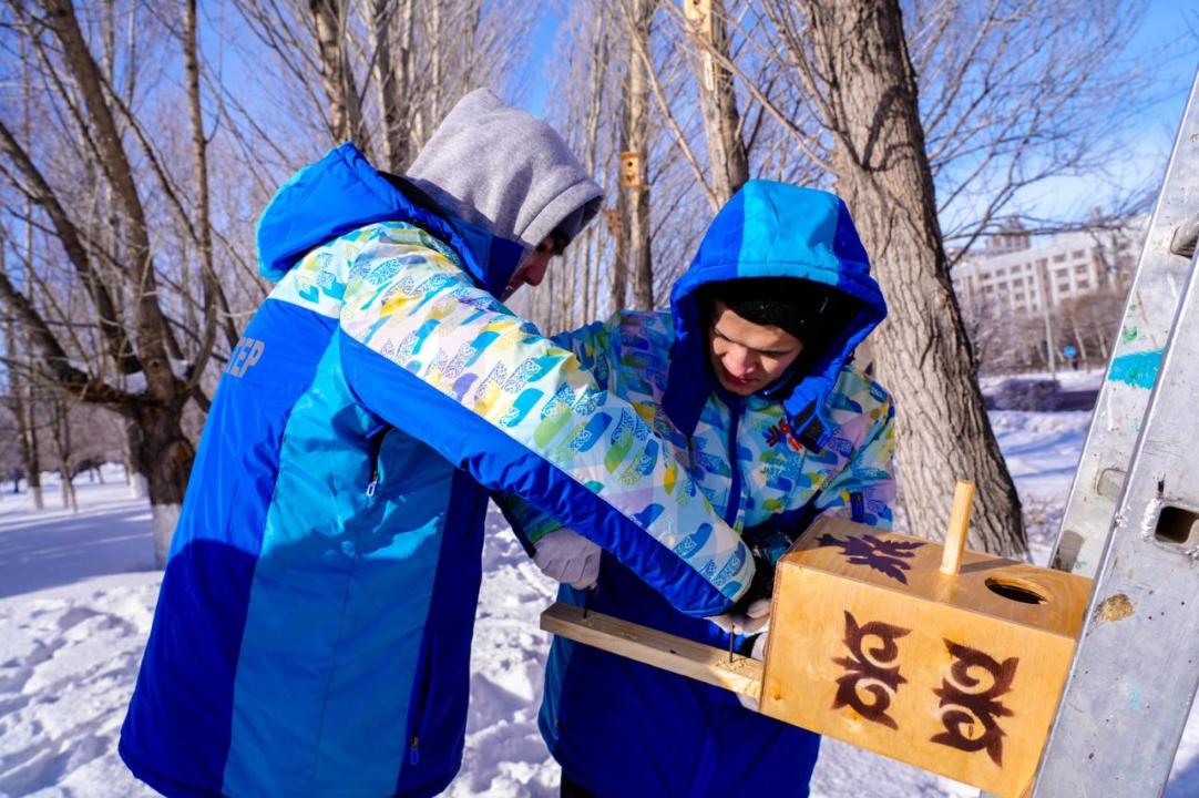 «Таза Қазақстан» акциясы аясында елордалық Құрылыс-техникалық колледжінің студенттері «Астана жастары» жастар ресурстық орталығының еріктілерімен бірлесе отырып, әл-Фараби мешітінің жанындағы саябаққа құс ұяларын ілді.