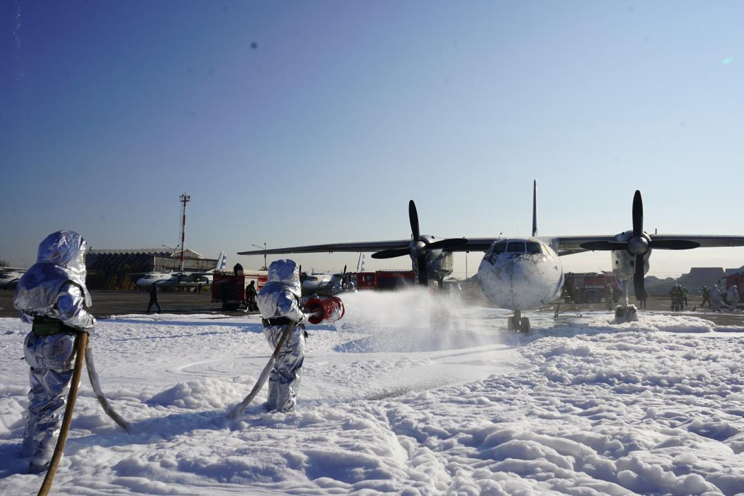 Өрт-тактикалық оқу-жаттығудың тактикалық мақсатына сәйкес «Алматы-Шымкент» бағыты бойынша ұшқан «АН-24» ұшағының апаттық қонуы салдарынан өрт орын алды. Әуе кемесінің бортында 48 жолаушы және 4 экипаж мүшесі болды. Шасси тағанының істен шығуы, қозғалтқыштың және оң жақ жанармай багының бұзылуы салдарынан жанармай төгіліп, өрт шықты. Әуежайдың ұшуларды іздестіру мен апатты-құтқаруды қамтамасыз ету қызметінің қызметкерлері қаланың өрт сөндірушілерімен және құтқарушыларымен бірлесіп әуе кемесіндегі өртті сөндіру, экипаж бен жолаушыларды құтқару жұмыстарын жүргізді.