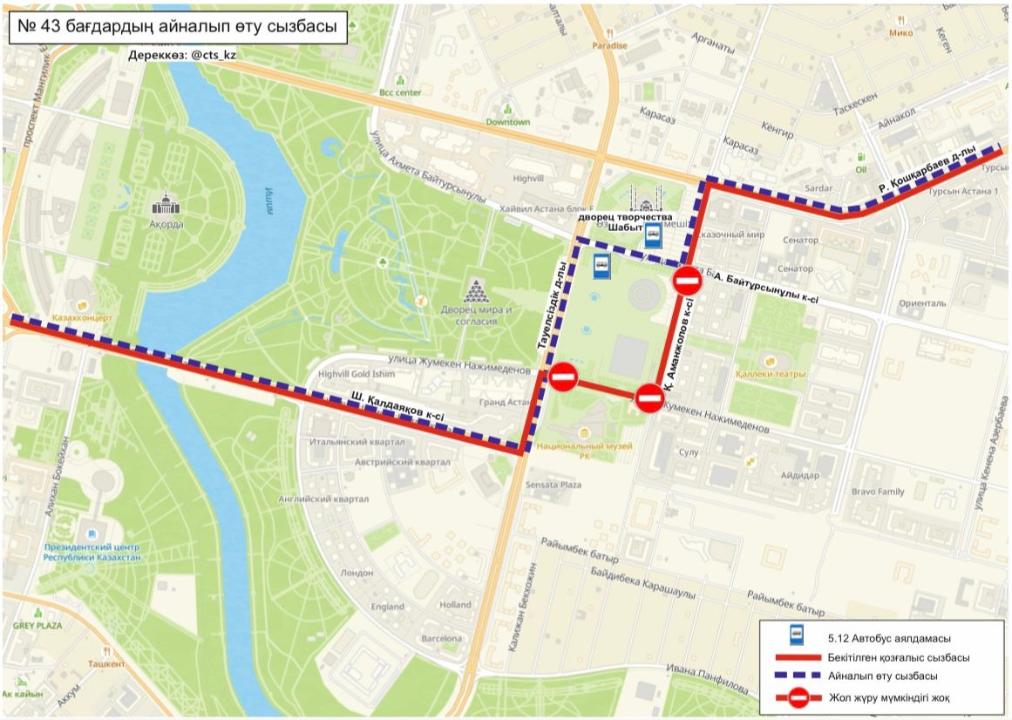 Осыған байланысты мына маршруттардың қозғалыс сызбалары уақытша өзгереді: №14, 32, 43, 50, 66, 84. Қоғамдық көлік штаттық режимде жұмыс істейтін болады. Жұмыс кестесі сағат 06:00-ден 23:30-ға дейін.