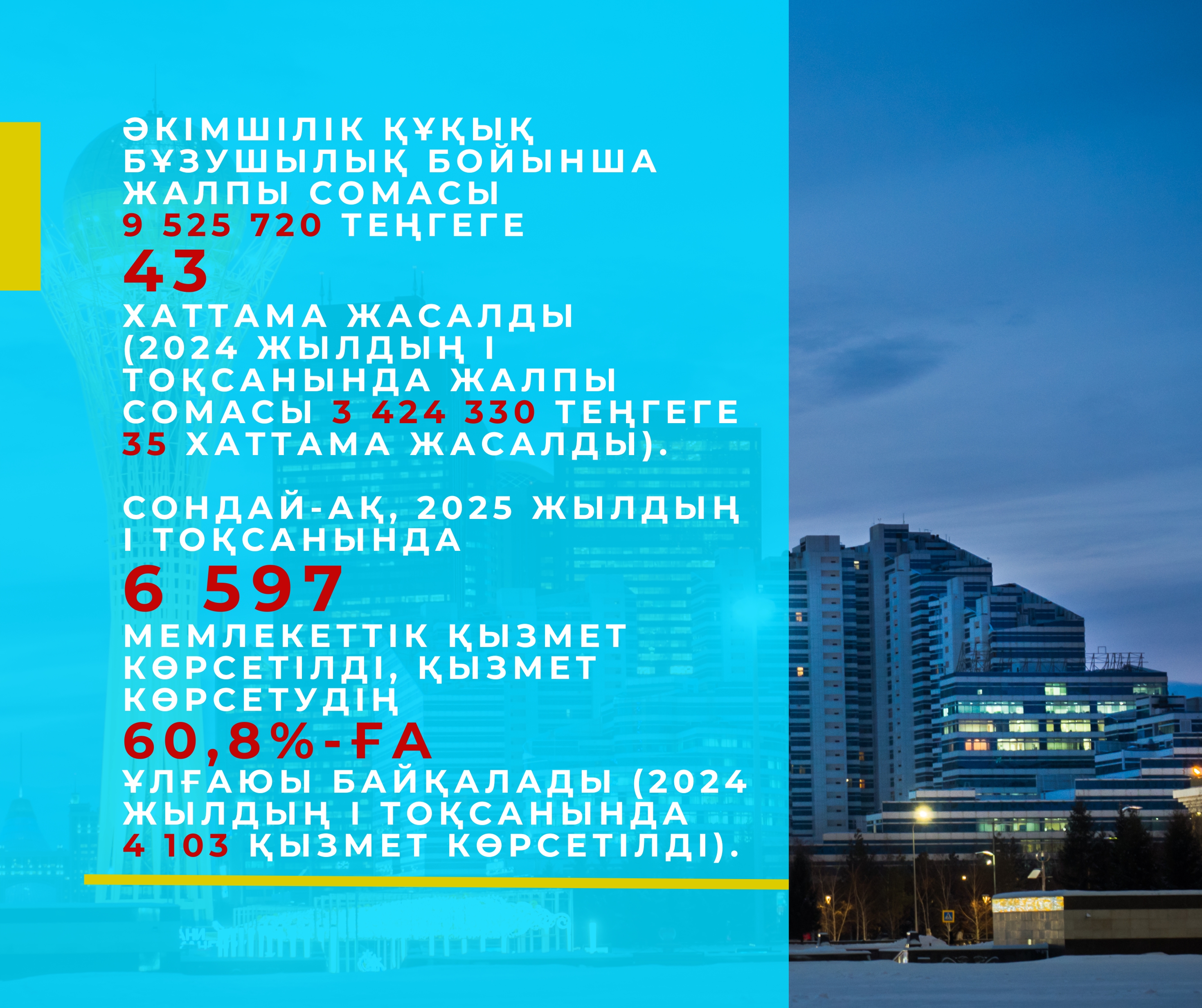 2025 жылдың І тоқсанының қорытындысы бойынша Департаментке 661 өтініш келіп түсті, 2024 жылдың ағымдағы кезеңімен салыстырғанда өтініштердің жалпы санының өсуі 26,4% құрады (2024 жылы 523 өтініш түсті). Әкімшілік құқық бұзушылық бойынша жалпы сомасы 9 525 720 теңгеге 43 хаттама жасалды (2024 жылдың І тоқсанында жалпы сомасы 3 424 330 теңгеге 35 хаттама жасалды). Сондай-ақ, 2025 жылдың І тоқсанында 6 597 мемлекеттік қызмет көрсетілді, қызмет көрсетудің 60,8% - ға ұлғаюы байқалады (2024 жылдың І тоқсанында 4 103 қызмет көрсетілді).