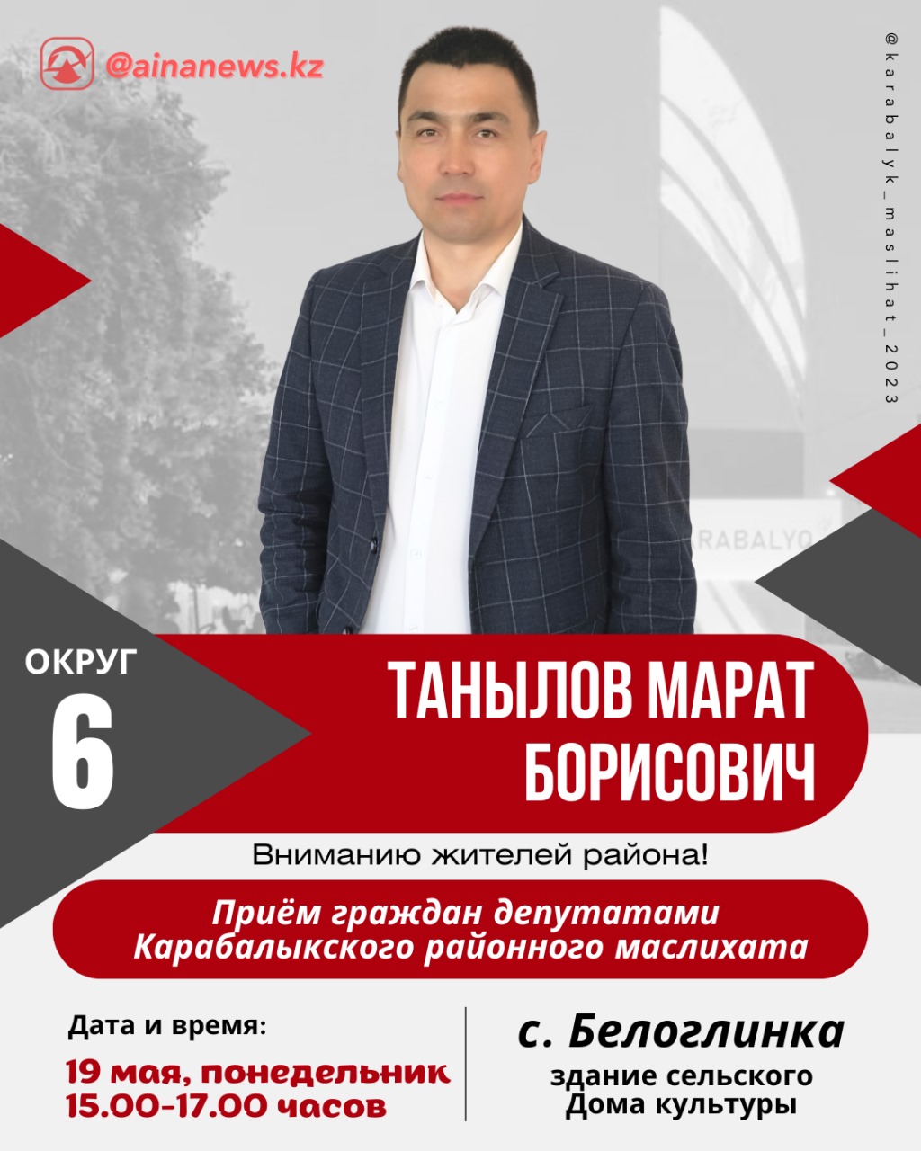 2025 жылғы 19 мамырда Белоглинка ауылында аудандық мәслихат депутаты М.Б. Танылов азаматтарды жеке қабылдады. Тұрғын Абай көшесін жөндеу мәселесіне жүгінді.