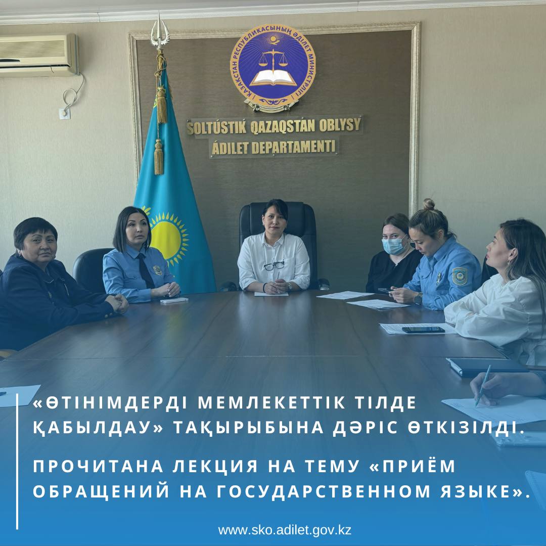 Солтүстік-Қазақстан облысы Әділет департаментінің сот орындаушыларының қызметін реттеу және бақылау бөлімі СҚО Әділет деапратментінің қызметкерлеріне «Өтінімдерді мемлекеттік тілде қабылдау» тақырыбына дәріс оқыды.