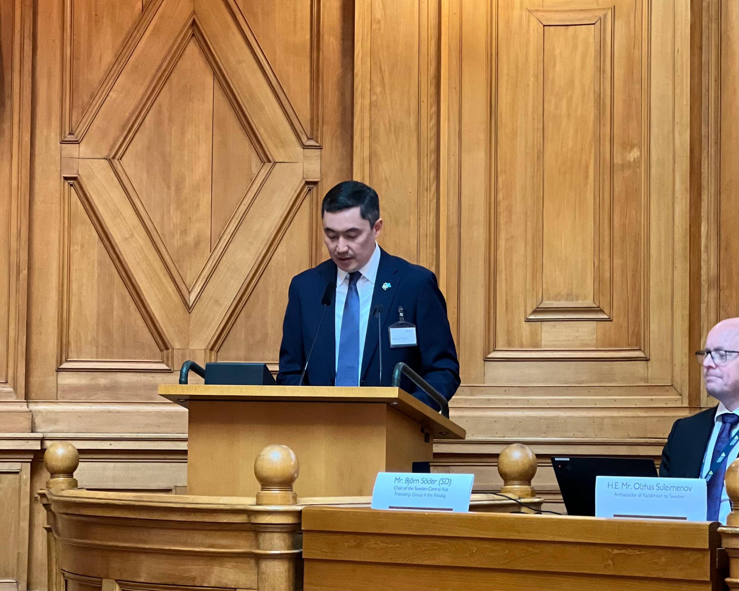 Қазақстанның Швециядағы Елшісі О.Сүлейменов өз сөзінде Қазақстанда жүзеге асырылып жатқан ауқымды саяси және әлеуметтік-экономикалық өзгерістер халықаралық әріптестердің сенімін нығайтуға және елдің инвестициялық тартымдылығын арттыруға ықпал ететінін атап өтті. Осының аясында Орталық Азия, оның ішінде цифрлық трансформация және Қазақстан мен Каспий теңізі арқылы Қытай мен Еуропаны байланыстыратын Транскаспий халықаралық көлік дәлізі (TITR) сияқты негізгі көлік маршруттарын дамыту арқасында маңызды және қолжетімді өңірге айналуда.
