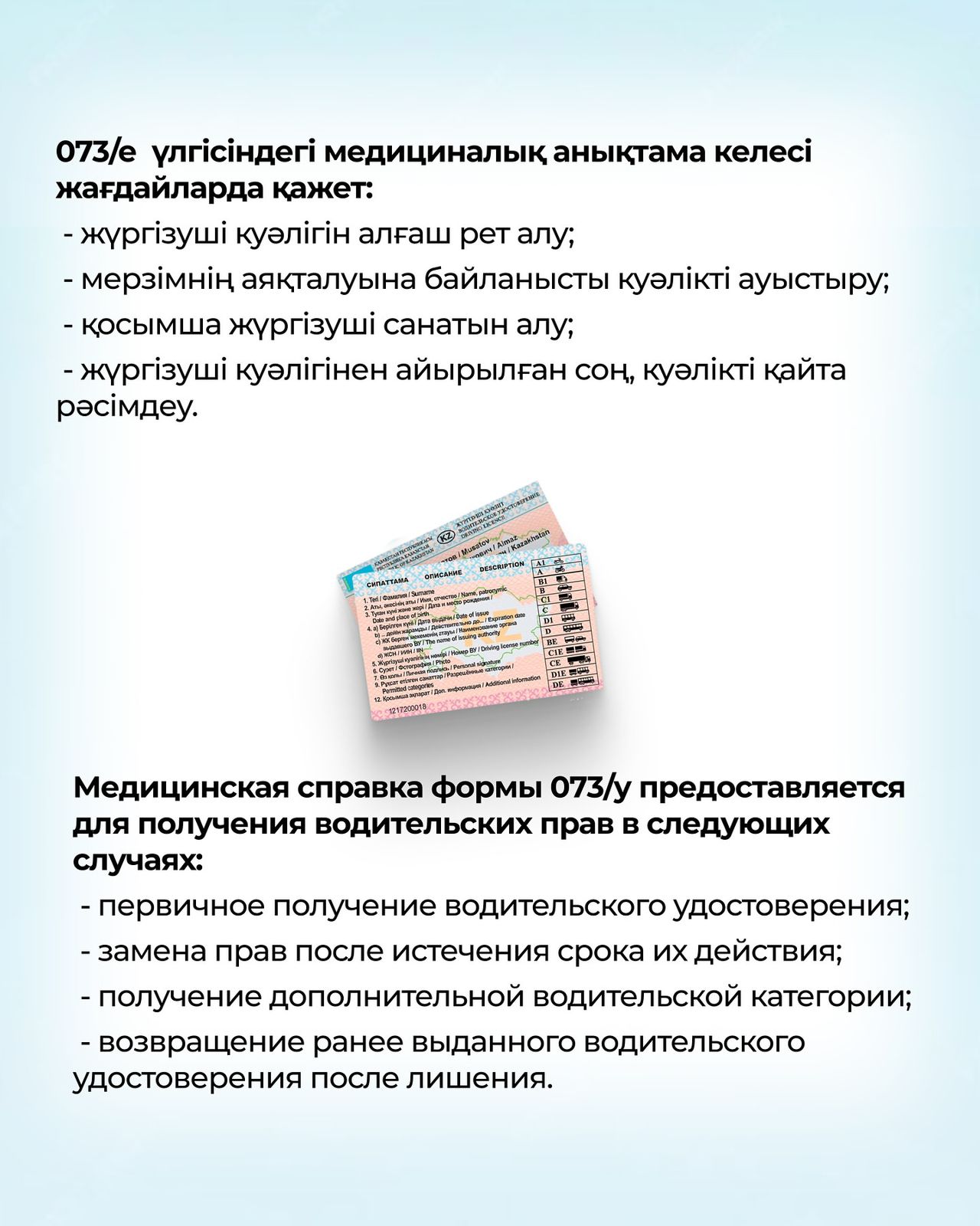Айта кету керек, жүргізуші куәлігінің қолданылу мерзімі аяқталмай тұрып ауыстырылған жағдайда, медициналық тексеруден өту талап етілмейді. Сондай-ақ, психоневрологиялық және наркологиялық диспансерлерден анықтама ұсыну қажеттілігі жоқ.