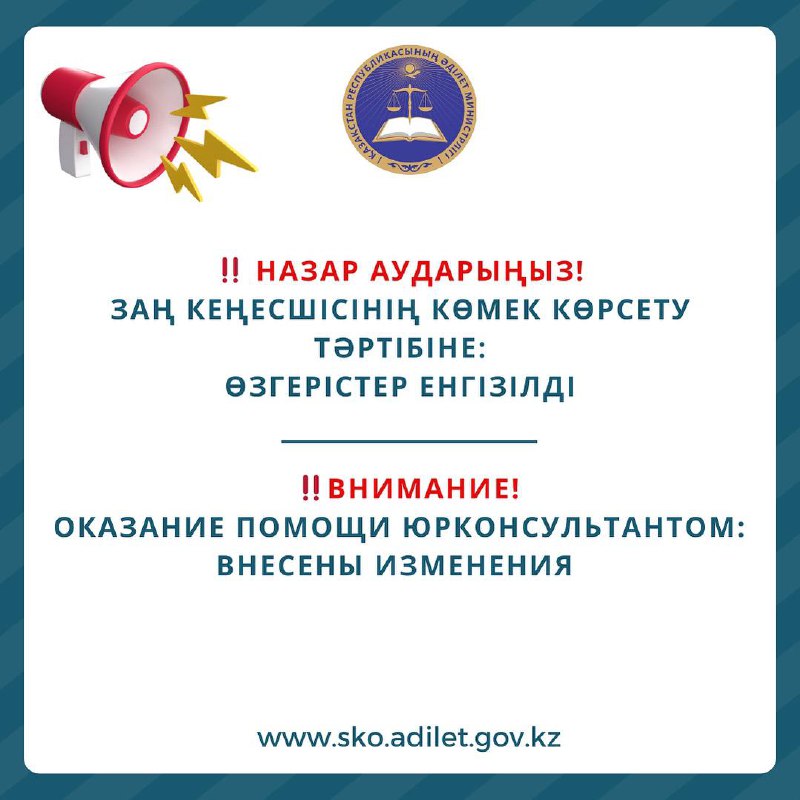 2025 жылғы 29 тамыздағы Әділет министрінің бұйрығымен заң консультанттарының заң консультанттары палаталары ұйымдастыратын мемлекет кепілдік берген заң көмегіне қатысу қағидаларына өзгерістер енгізілді.