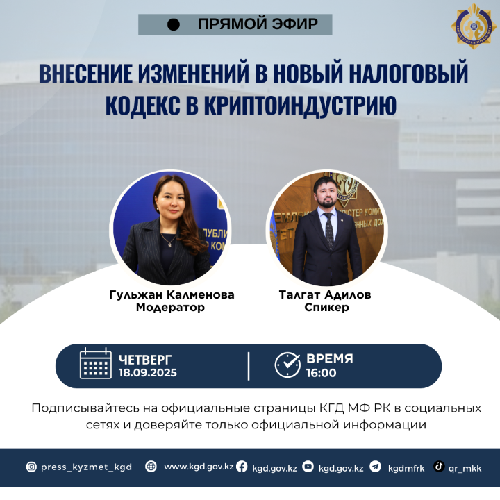 АҢДАТПА! Instagram желісіндегі @press_kyzmet_kgd парақшасында «Криптоиндустрияға арналған жаңа салық кодексіне түзетулер енгізу» тақырыбында тікелей эфир өтеді.