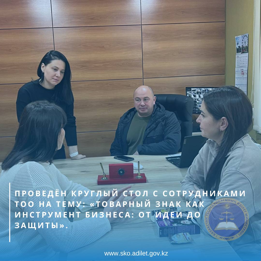 Бөлім басшысы ЖШС қызметкерлерімен «Тауар белгісі бизнес құралы ретінде: идеядан қорғауға дейін» тақырыбында дөңгелек үстел өткізді. Кездесу сауда белгісінің бизнес стратегиясының негізгі элементі ретіндегі маңыздылығына арналды. Бұдан басқа, құқықтарды ұжымдық басқару жөніндегі ұйымдардың жұмысы және олармен шарттар жасасу қажеттілігі туралы айтылды.