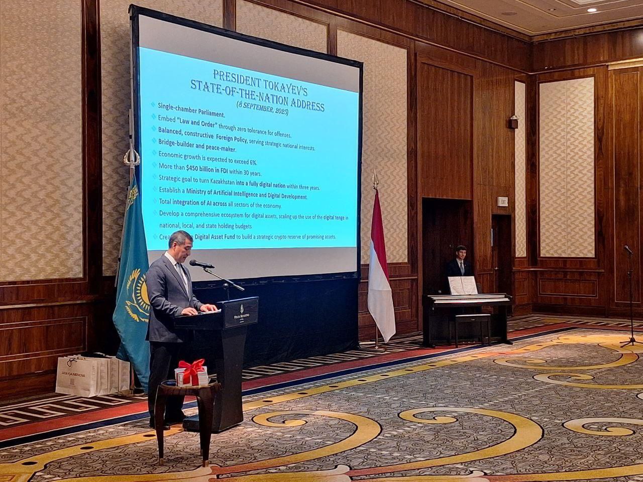 Қазақстан Елшісі Сержан Әбдікәрімов Қоғам мүшелеріне 1990 жылғы 25 қазанда қабылданған еліміздің мемлекеттік егемендігі туралы декларацияның тарихи маңыздылығы, Қазақстан-Индонезия әріптестігінің қазіргі жағдайы мен болашағы, ҚР Президенті Қ.К.Тоқаевтың «Жасанды интеллект дәуіріндегі Қазақстан: өзекті мәселелер және оны түбегейлі цифрлық өзгерістер арқылы шешу» атты қыркүйек айында Қазақстан халықына арнаған Жолдауында қойған міндеттер аясында Қазақстанның қазіргі дамуы жөнінде мәлім етті. Осыған орай, дипломат Қазақстан мен Индонезия арасындағы өзара қызығушылық салалардағы көп қырлы ынтымақтастықты кеңейту үшін үлкен әлеуеттің, жаңа бағыттардың және қолайлы мүмкіндіктердің бар екенін атап өтті.