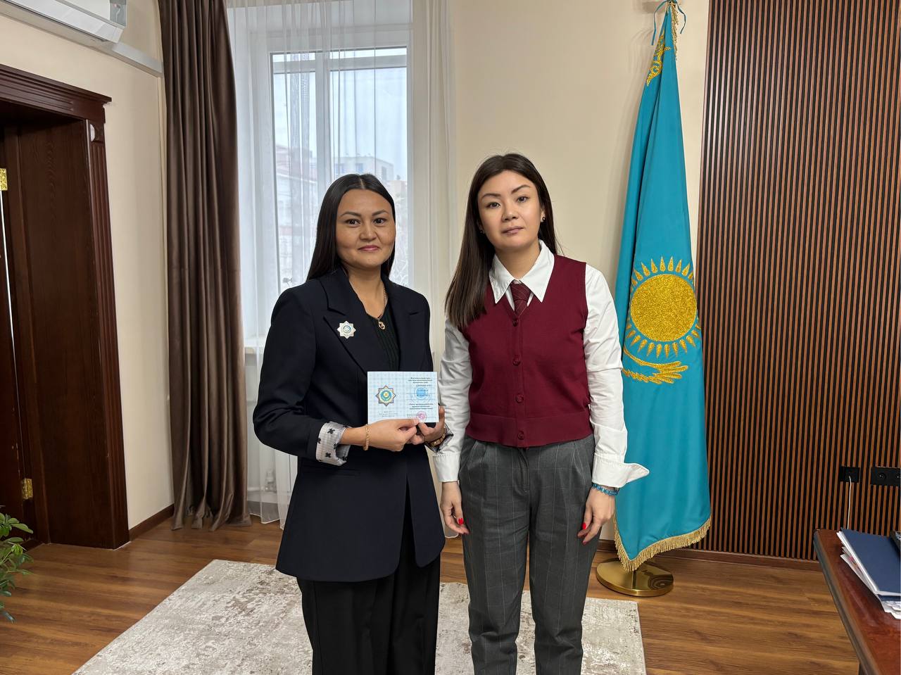 «Заң мен Тәртіп» тұжырымдамасын іске асыру аясында 2025 жылдың 10 қарашасында Қостанай облысы Әділет департаментінің басшысы Алия Аманжулова Қазақстан Республикасы Әділет министрлігінің ведомстволық медалін жеке сот орындаушылардың өңірлік палатасының жеке сот орындаушысы Салтанат Альшимбаеваға табыс етті.
