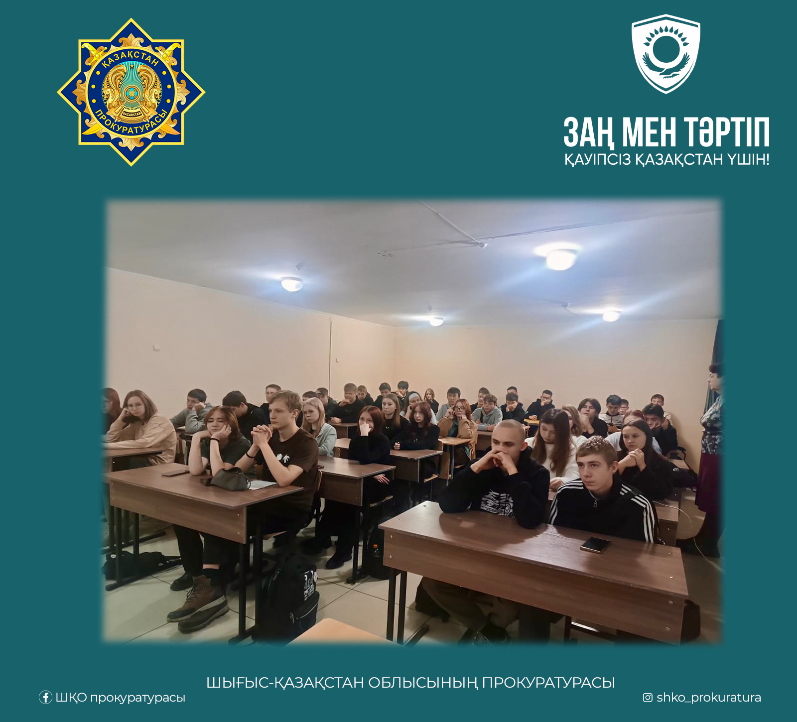Статистика көрсеткендей, қазіргі уақытта қылмыстың 60%-дан астамын колледж студенттері жасайды.Осыған байланысты, «Заң мен тәртіп» тұжырымдамасы аясында прокурорлар облыс орталығындағы алты колледждің (Өскемен көпсалалы технологиялық колледжі, Өскемен құрылыс-техникалық колледжі, Өскемен технология және қызмет көрсету колледжі, Көлік және тіршілік қауіпсіздігі колледжі, Қ.Нұрғалиев атындағы жоғары колледжі және Өскемен көпсалалы колледжі) студенттерімен «Жастар және заң: кәмелетке толмағандар арасындағы қылмыстың алдын алу» тақырыбында кездесулер өткізді.