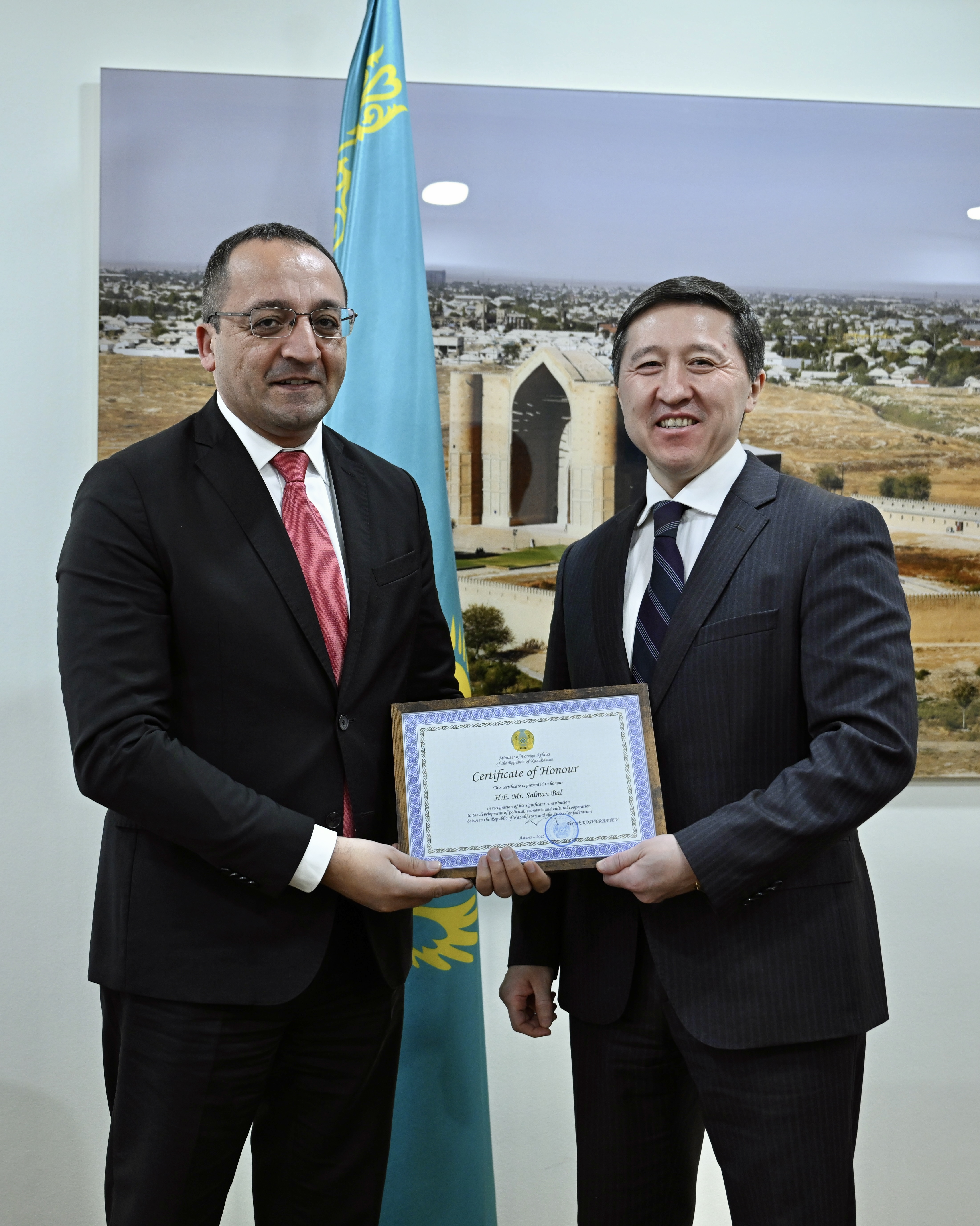 25.11.2025 08:01:05 45Астана, 2025 жылы 24 қараша – Қазақстан Республикасы Сыртқы істер министрінің орынбасары Арман Исетов Швейцария Конфедерациясының Елшісі Салман Балды оның дипломатиялық миссиясының аяқталуына байланысты қабылдады.