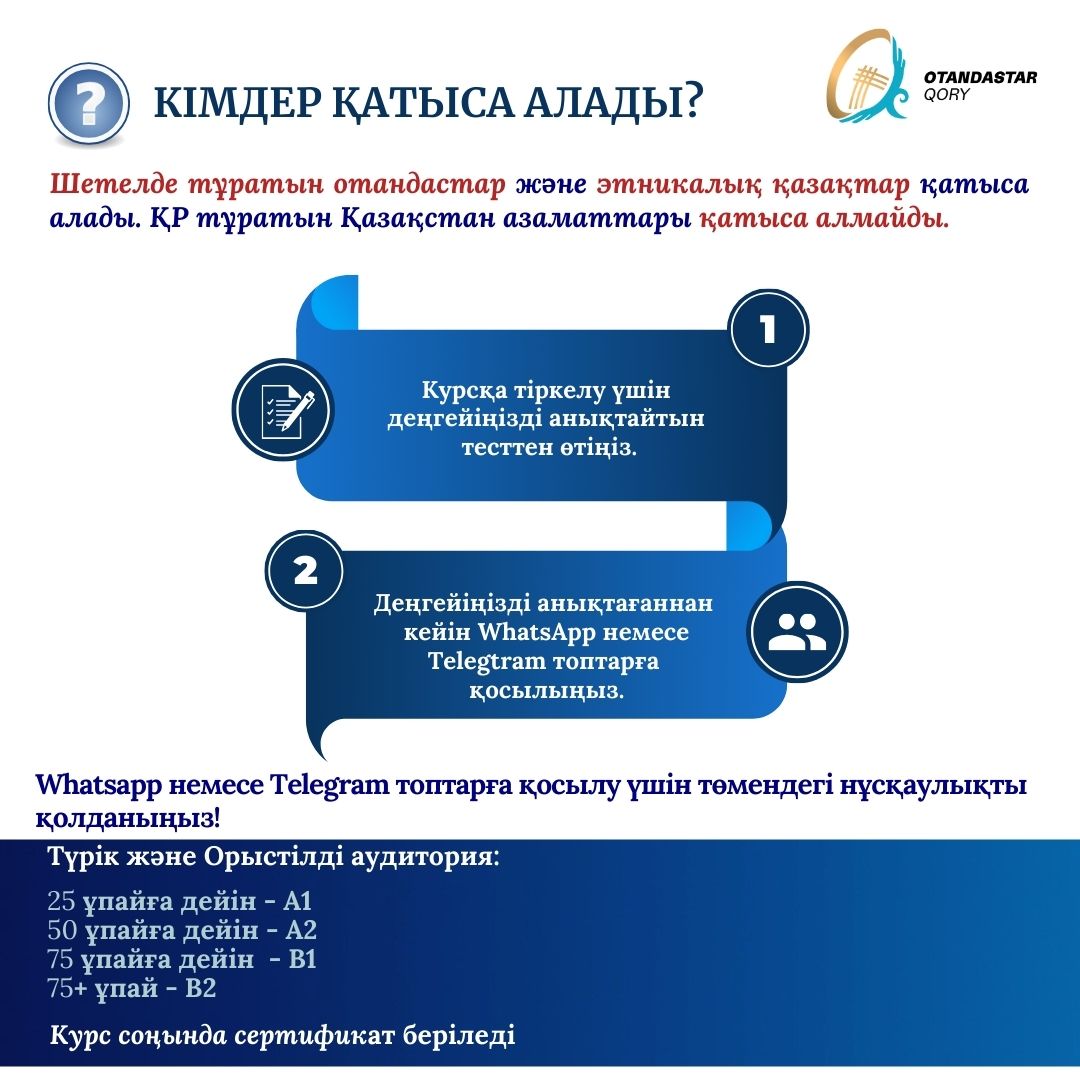 Курсқа тіркелу және қатысу үшін деңгейіңізді анықтайтын тесттен өтіңіз 🔽