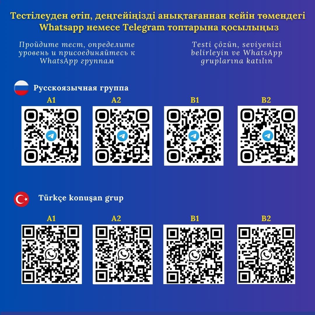 WhatsApp және Telegram группаға қосылғаннан кейін оқытушының нұсқаулық беруін күтуіңізді сұраймыз. Оқытушы сабақ кестесін барлық қатысушылар тесттен өтіп болғаннан кейін жолдайды. Сабақ кестесі бойынша онлайн қазақ тілі курсы 2026 жылдың наурыз айынан басталады.