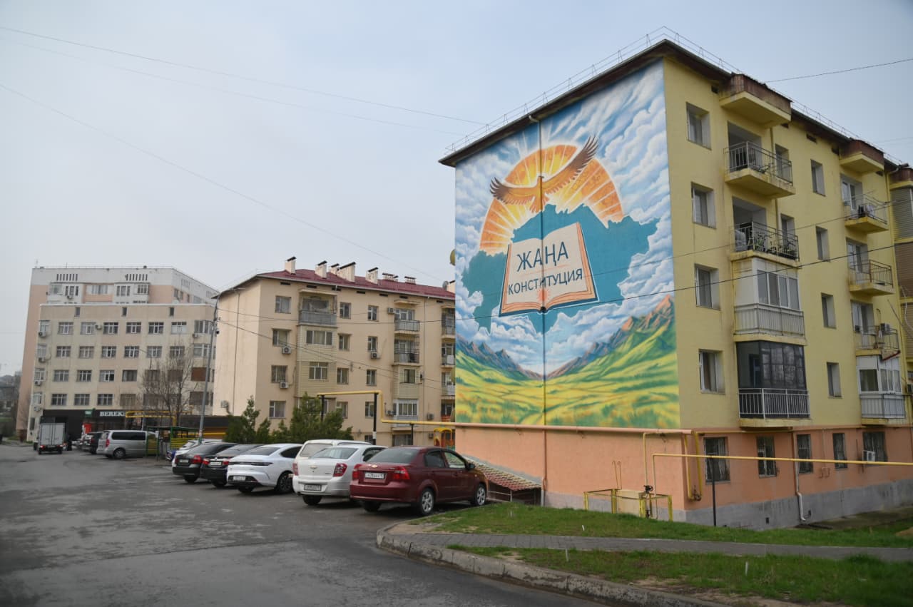 Шымкент қаласында жаңа Конституцияны қолдау мақсатында көп қабатты тұрғын үйдің қасбетіне ауқымды мурал салынды. Нұрсәт-2 шағын ауданындағы №17 үйге салынған туындының биіктігі 14 метрді, ал, ені 10 метрді құрайды.