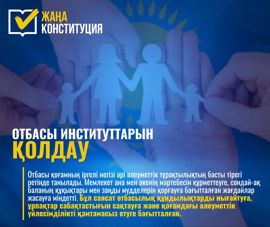 Жаңа Конституция жобасында отбасы институтын қолдау мәселесіне ерекше назар аударылған. Негізгі заңда отбасы қоғамның іргелі негізі әрі әлеуметтік тұрақтылықтың басты тірегі ретінде танылып, оны қорғау мен қолдау мемлекет саясатының маңызды бағыттарының бірі ретінде айқындалған.