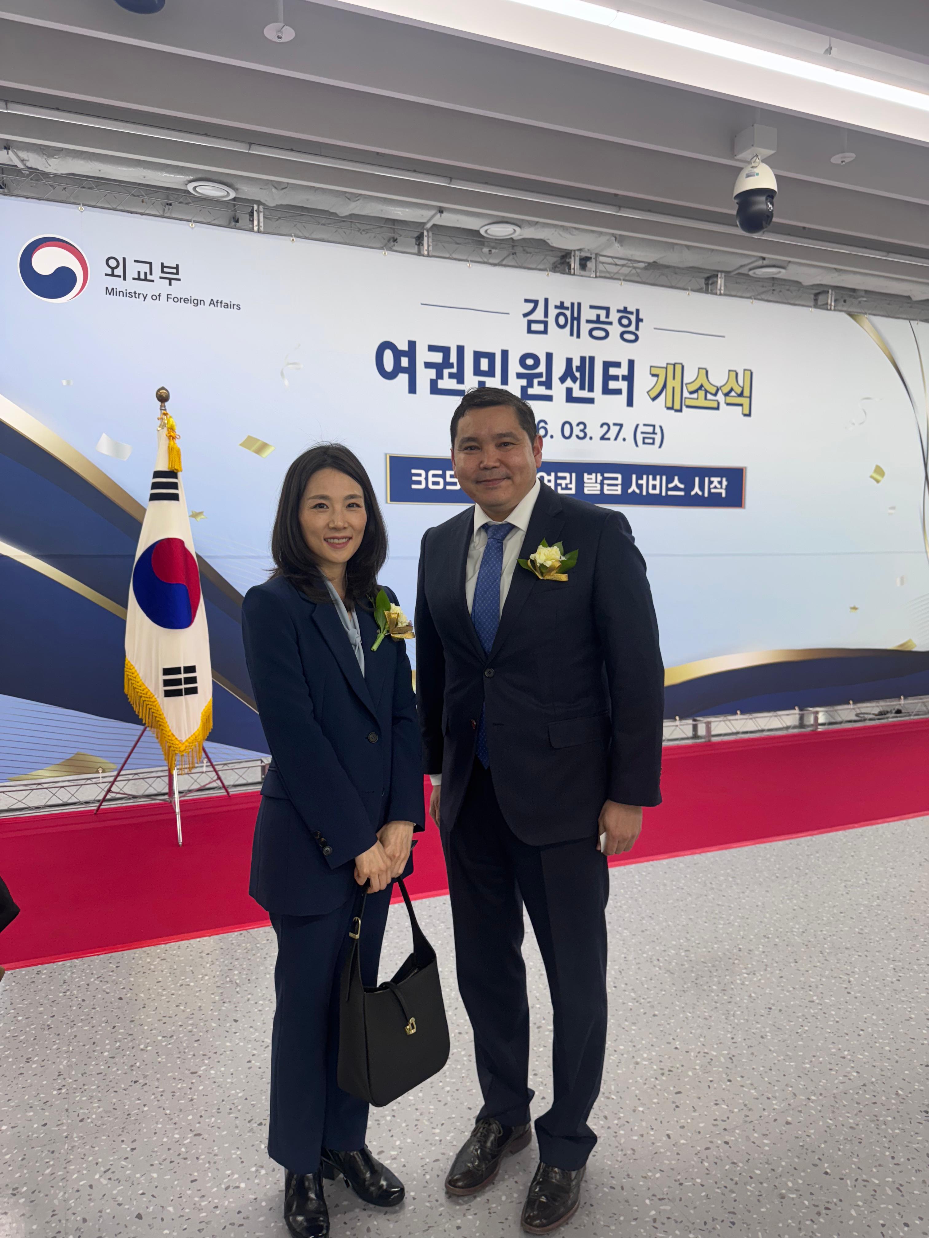2026 жылғы 27 наурызда Қазақстан Республикасының Пусан қаласындағы Бас консулдығы Пусан қаласындағы Кимхэ халықаралық әуежайында Паспорттық қызмет көрсету орталығының ашылу салтанатты рәсіміне қатысты.