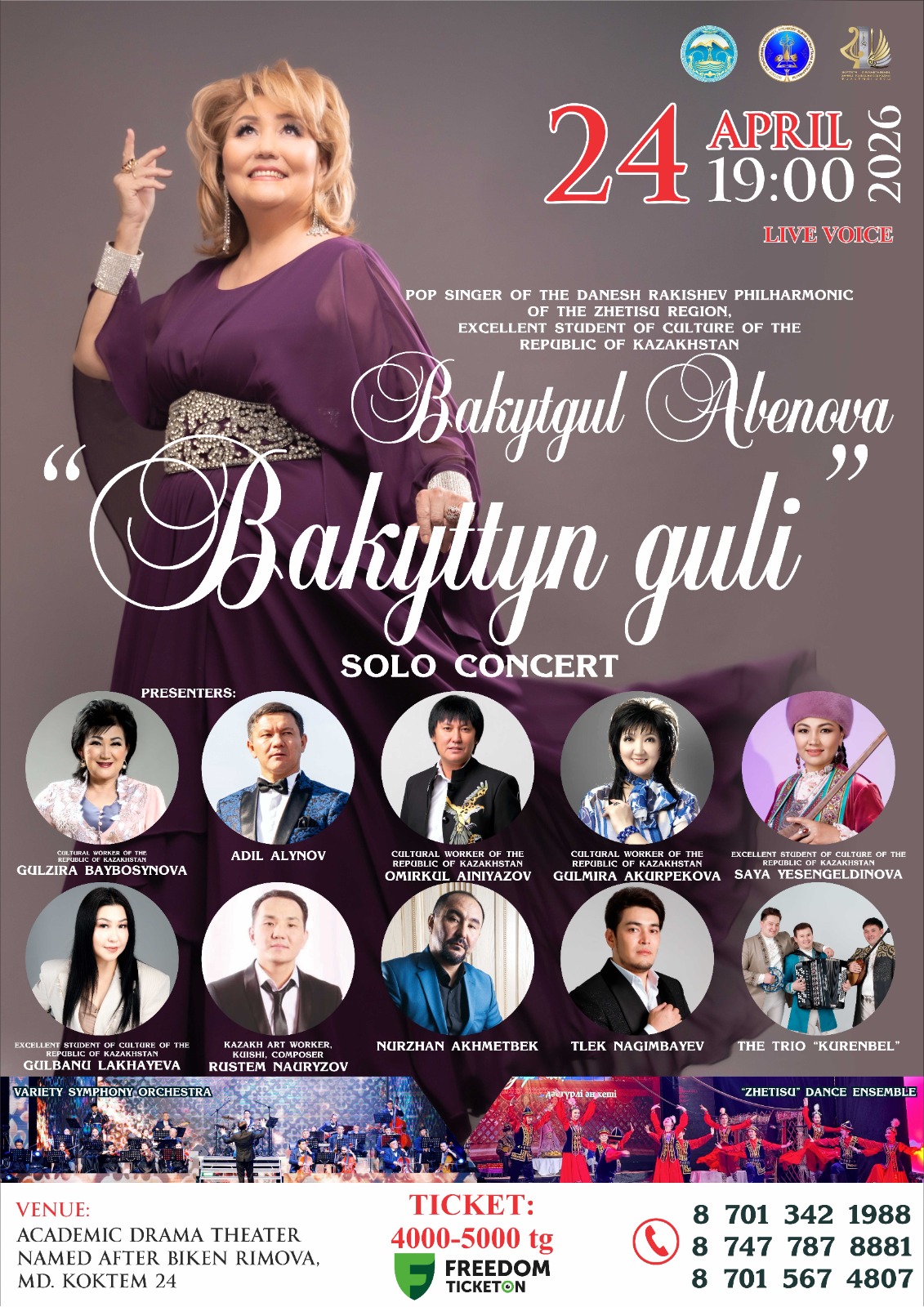 Құрметті өнер сүйер қауым! Сіздерді 24 сәуір күні сағат 19:00-де өтетін ерекше музыкалық кешке шақырамыз! Жетісу облысының Дәнеш Рақышев атындағы филармонияның эстрада әншісі, Қазақстан Республикасының мәдениет саласының үздігі Бақытгүл Әбенованің «Бақыттың гүлі» атты жеке концерті өтеді. Кеш қонақтары: Өмірқұл Айниязов, Гүлмира Ақүрпекова, Сая Есенгелдинова, Гүлбану Лахаева, күйші, композитор Рүстем Наурызов, Нұржан Ахметбек, Тілек Нағымбаев, «Күреңбел» триосы, эстрадалық-симфониялық оркестр, «Жетісу» би ансамблі. Өтетін орны: Бикен Римова атындағы академиялық драма театры. Кешімізге келіп, жанды дауыстағы әсем әндер мен ерекше атмосфераның куәсі болыңыздар! Билет бағасы:4000-5000 мың тенге. Байланыс телефон: 8-701-342-19-88, 8-747-787-88-81, 8-701-567-48-07.
