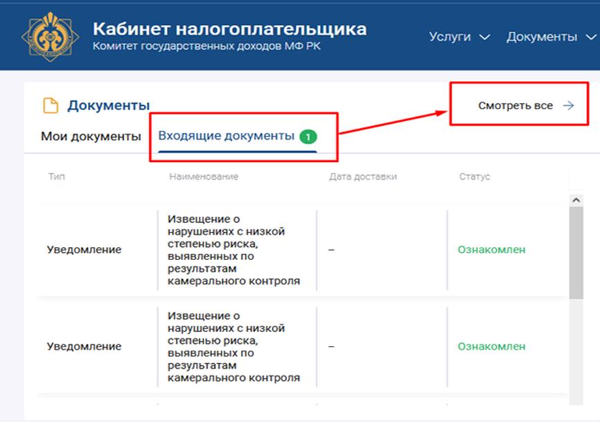 Ол үшін басты бетте "кіріс құжаттар" қойындысына өтіп,"барлығын қарау" түймесін басу керек: