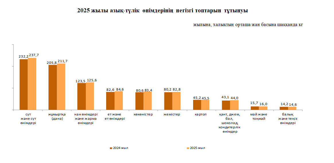 2025 жылы алдыңғы жылмен салыстырғанда барлық азық-түлік өнімдерінің негізгі топтары бойынша тұтыну көрсеткішінің өсуі байқалды.