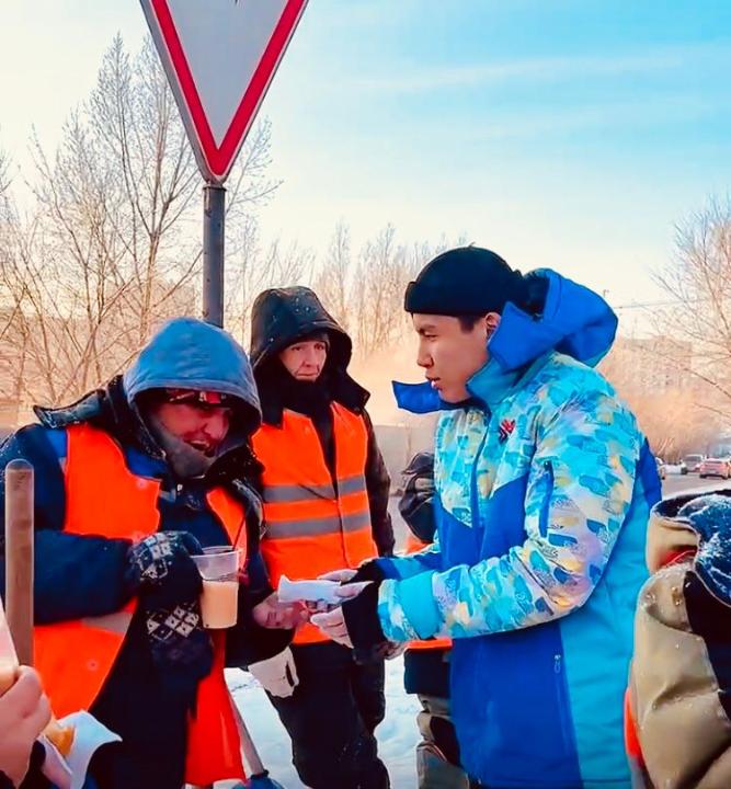 Астаналық жастар аязды күні көше тазалап жүрген жұмысшыларға ыстық шай ұсынды