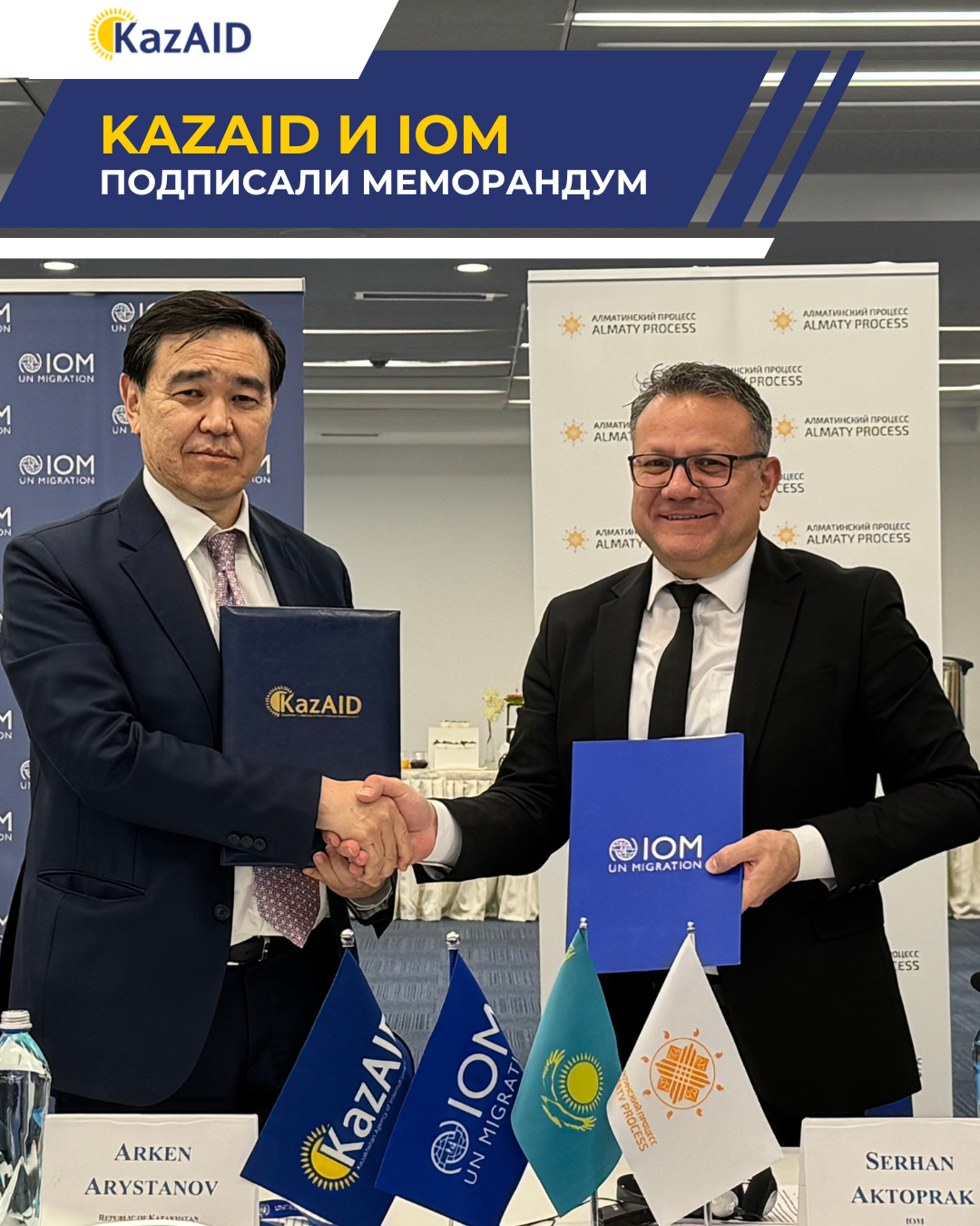 KazAID пен IOM ынтымақтастық туралы меморандумға қол қойды2025 жылғы 28 қараша, Алматы қаласы – “KazAID” Қазақстанның халықаралық даму агенттігі мен Халықаралық көші-қон ұйымы (IOM) ынтымақтастық туралы меморандумға қол қойды.Алматы процесі аясындағы өңірлік жобаларды қолдауға және көші-қон деректері бойынша институционалдық өзара іс-қимылды нығайтуға бағытталған құжатқа KazAID басқарма төрағасы Аркен Арыстанов пен IOM-ның Қазақстандағы басшысы Серхан Актопрак қол қойды.Меморандумға қол қою Қазақстанның Орталық Азиядағы көші-қон саласындағы үйлестірілген тәсілдерді ілгерілету және әріптестікті күшейту жөніндегі ұмтылысын көрсетеді.Меморандум Алматы процесінің техникалық сарапшылар тобының отырысы аясында қол қойылды. Отырыста тиімді, дәлелді мемлекеттік саясат қалыптастыру үшін көші-қон деректерін стандарттау, салыстырмалық және цифрландыру мәселелері талқыланды. Ақпарат көзі : https://www.gov.kz/memleket/entities/kazaid/press/news/details/1115629?lang=kk