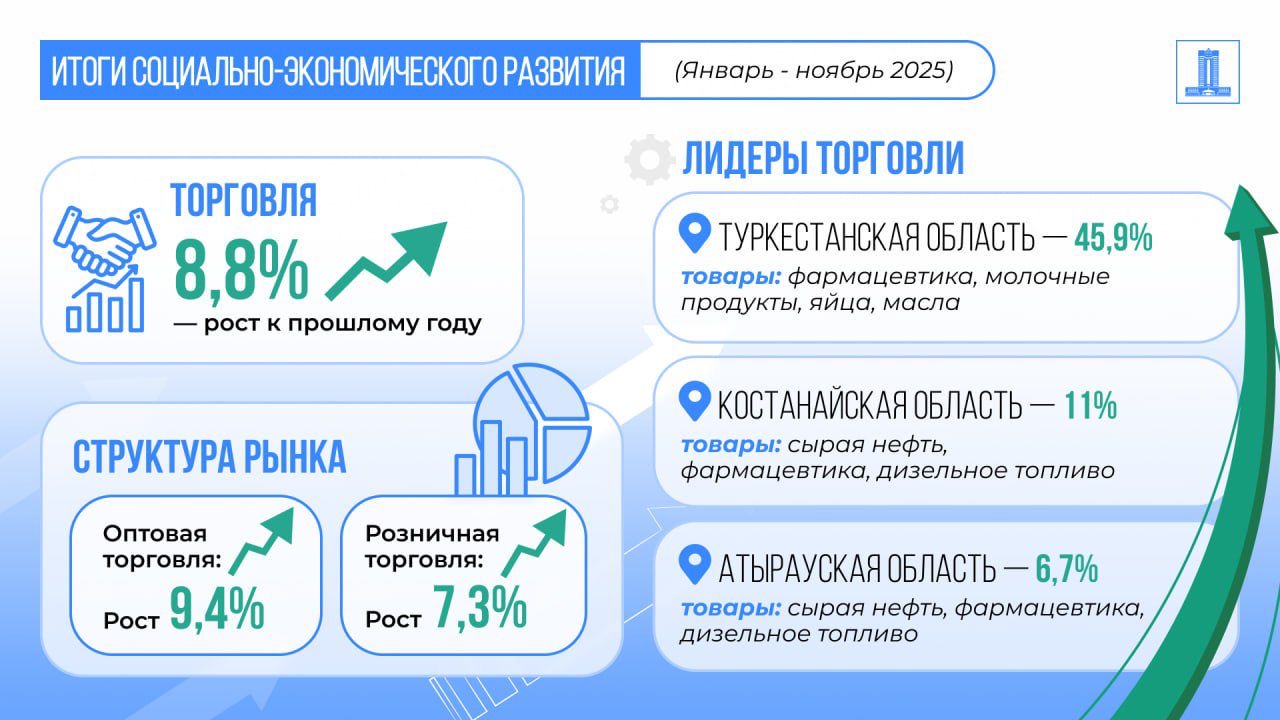 Итоги социально-экономического развития за 11 месяцев 2025 года рассмотрели на заседании Правительства.По данным МНЭ РК, главный показатель – рост ВВП, достиг 6,4%. В рамках исполнения поручений Президента по обеспечению качественного развития и повышению благосостояния граждан экономика страны демонстрирует уверенные темпы роста. Ключевыми драйверами выступили промышленность, где рост ускорился с 7,3% до 7,4%, и сельское хозяйство с динамикой 6,1%. Стабильное развитие показывают и другие сектора реальной экономики. В частности, сфера транспорта выросла на 20,3%, строительство – на 14,7%, а торговля показала увеличение на 8,8%.«Экономика адаптировалась к внешним условиям и вышла на траекторию устойчивого развития. Мы видим ускорение в базовых отраслях, что создает прочный фундамент для выполнения социальных обязательств и реализации масштабных инфраструктурных проектов», — доложил заместитель Премьер-министра – министр национальной экономики Серик Жумангарин.Источник информации : https://www.gov.kz/memleket/entities/economy/press/news/details/1127149?lang=kk