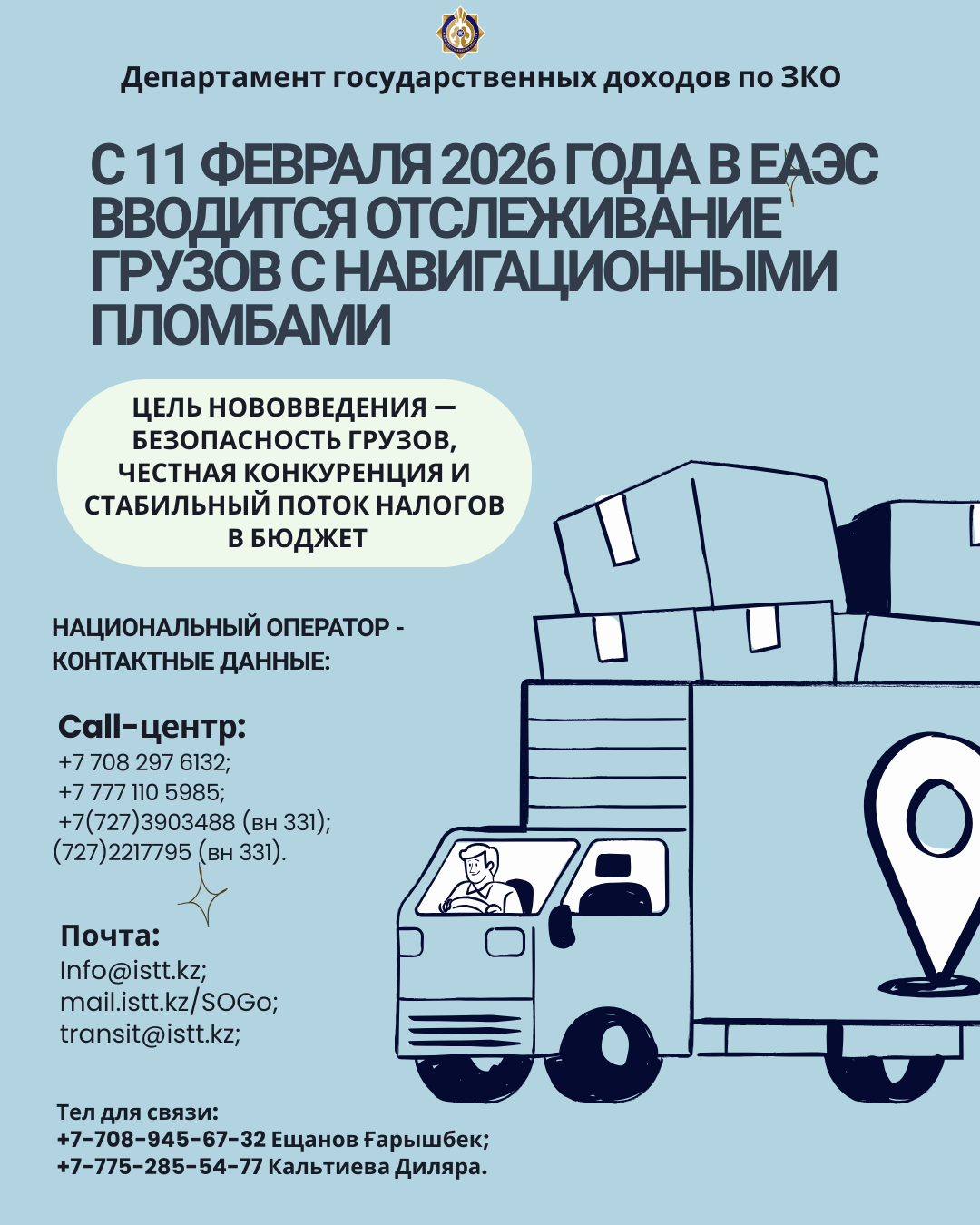 Навигационные пломбы для перевозок с 11 февраля 2026 годаДепартамент государственных доходов ЗКО информирует о внедрении системы отслеживания товаров с помощью навигационных пломб в рамках ЕАЭС.🔹 Что это даёт бизнесу:• Минимум лишних проверок и контроля 🚦• Защита груза от несанкционированного вскрытия 🔒• Удобное управление перевозкой через «личный кабинет» 💻🔹 Что отслеживается с 11 февраля 2026 года:• Транзитные, экспортные и товары взаимной торговли• Автомобильный и железнодорожный транспорт• «Санкционные» товары, алкоголь, табак, одежда, обувь, электроника🔹 Этапы внедрения:1️⃣ 11 февраля — первые группы товаров2️⃣ Через 180 дней — расширение списка товаров3️⃣ Через 480 дней — полный перечень всех перевозок🔹 Национальный оператор:ТОО «Институт космической техники и технологий» разработал систему «Транзит» с «личным кабинетом» для управления перевозками и оплаты услуг операторов ЕАЭС.⚠️ Важно: перевозчики, экспедиторы и участники логистики обязаны соблюдать требования законодательства ЕАЭС и Казахстана для бесперебойной работы системы.Источник информации : https://www.gov.kz/memleket/entities/kgd-zko/press/news/details/1149785?lang=kk