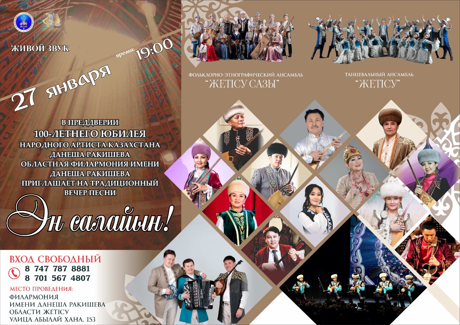 Уважаемые жители и гости города Талдыкорган! Приглашаем Вас на традиционный вечер песни «Ән салайын» областной филармонии имени Данеша Ракишева, посвященный 100-летнему юбилею народного артиста Казахстана Данеша Ракишева, который состоится 27 января в 19.00.В концерте участвуют:Ансамбль танца "Жетісу"Фольклорно-этнографический ансамбль "Жетісу сазы"Певцы филармонииМесто проведения:Областная Филармония имени Данеша РакишеваУлица Абылай хана, 153Вход свободный Не пропустите этот впечатляющий вечер, посвященный национальному искусству!С нетерпением ждем встречи с вами!Источник информации : https://www.gov.kz/memleket/entities/zhetysu-archive/press/news/details/1147209?lang=kk