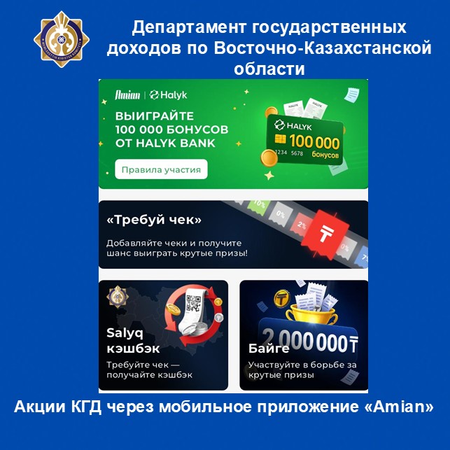 В целях повышения налоговой культуры населения, уровня соблюдения кассовой дисциплины и снижения теневой экономики Комитет государственных доходов Министерства финансов РК реализует ряд акций через мобильное приложение «Amian»:1. «Требуй чек – выиграй приз»Сроки: 3 апреля – 31 декабря 2025 года.Участие: регистрация фискальных чеков через приложение.Призы: денежные и ценные подарки. «Байге»Сроки: 1 мая – 31 декабря 2025 года.Ежеквартальные итоги.20 победителей (по регионам) получают по 100 000 тг за наибольшее количество чеков. 3. Пилотный проект «Salyq кэшбэк»Сроки: 15 марта – 31 декабря 2025 года.Суть: возврат 2% от суммы покупок у субъектов МСБ.Средства можно перевести на карту или баланс телефона. Ежемесячные розыгрыши с Halyk BankСроки: 1 июня – 30 ноября 2025 года.Призы: до 100 000 бонусов.Условия: покупки картой или QR Halyk. Значимость чеков:Чек подтверждает сделку и защищает права потребителя.Невыдача чека ведёт к занижению доходов бизнеса и снижению налоговых поступлений.Каждый чек — вклад в прозрачность экономики и честное предпринимательство. Также в приложении «Amian» доступен сервис подачи жалоб на нарушения кассовой дисциплины (невыдача чека, отказ в оплате картой).Источник информации : https://www.gov.kz/memleket/entities/kgd-vko/press/news/details/1070699?lang=kk