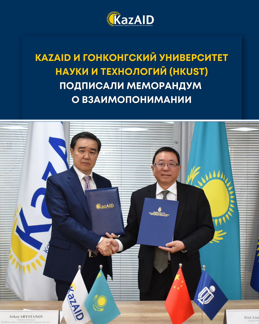 KazAID и Гонконгский университет науки и технологий (HKUST) подписали меморандум о взаимопонимании23 сентября 2025 года, г.Астана - состоялась встреча представителей KazAID и Hong Kong University of Science and Technology (HKUST).Стороны обсудили систему высшего образования в Центральной Азии, текущие проекты KazAID и модели международного сотрудничества. Представители Hong Kong University of Science and Technology (Guangzhou) представили проект Глобальной академии GBA по зелёному лидерству и инновациям. Отдельное внимание уделили перспективам совместной работы в области искусственного интеллекта, изменения климата и научно-исследовательских разработок.По итогам встречи был подписан трехсторонний Меморандум о взаимопонимании, который скрепили подписями Аркен Арыстанов, Председатель Правления KazAID, и профессор Lionel M. Ni, Президент Hong Kong University of Science and Technology (Guangzhou) и профессор Charles Wang-Wai NG, Вице-президент Hong Kong University of Science and Technology.Источник информации : https://www.gov.kz/memleket/entities/kazaid/press/news/details/1073674?lang=kk