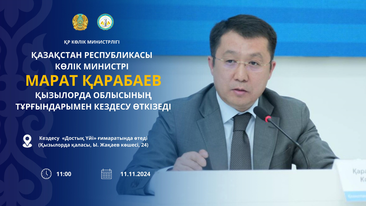АНОНС! Министр транспорта Республики Казахстан Марат Карабаев проведёт встречу с жителями Кызылординской области 16.11.2024