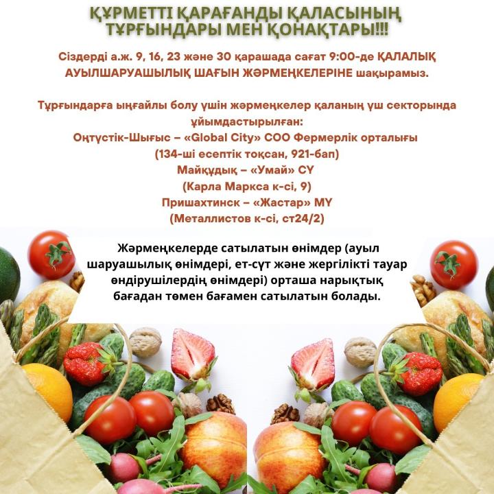 Карагандинцев приглашают 9, 16, 23 и 30 ноября на городские сельскохозяйственные мини-ярмарки. Начало торговли в 09:00.Ярмарки пройдут в трёх локациях:- на Юго-Востоке – фермерский центр Global City, 134-й учётный квартал, строение 921;- в Майкудуке – ТД «Умай», улица Карла Маркса, 9;- в Пришахтинске – ДК «Молодёжный», улица Металлистов, строение 24/2.Покупателям будет представлена сельскохозяйственная, мясо-молочная продукция и товары местных производителей по ценам ниже средних рыночных. Источник информации : https://www.gov.kz/memleket/entities/karaganda/press/news/details/879929