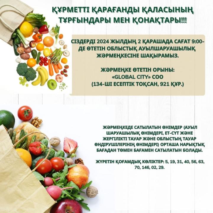 Карагандинцев приглашают 2 ноября на очередную сельскохозяйственную ярмарку. Свои продукты представят производители районов области.Ярмарка порадует разнообразием продукции. Для продажи заготовлено более 500 тонн мяса, рыбы, молочных продуктов и овощей. Также можно будет приобрести яйца куриные, мёд, колбасы, ремесленные изделия и многое другое.Начало в 09:00.Ярмарка пройдёт на территории ТРЦ Global City по адресу: 134-й учётный квартал, строение 921.Добраться можно на автобусах: 5, 19, 31, 40, 56, 63, 70, 146, 02, 29.Источник информации : https://www.gov.kz/memleket/entities/karaganda/press/news/details/873969