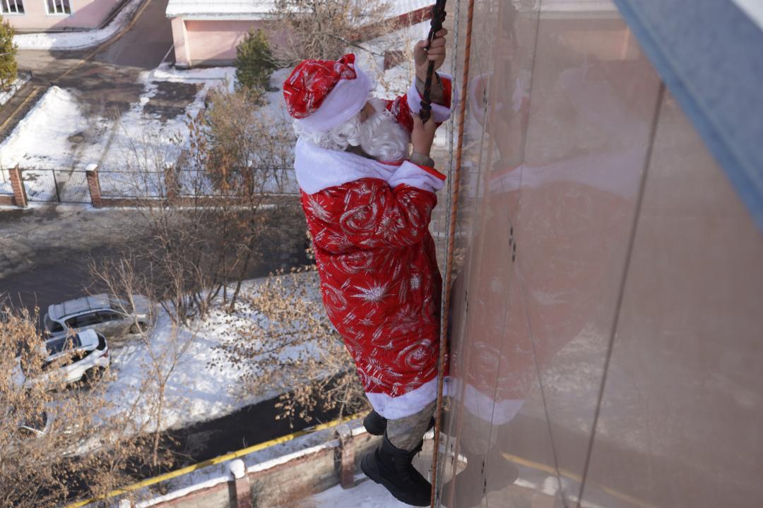 Юные альпинисты удивили малышей креативным подходом. Воспитанник клуба в образе Деда Мороза спустился с крыши и вошел в окно палаты, чем несказанно удивил восторженную детвору.