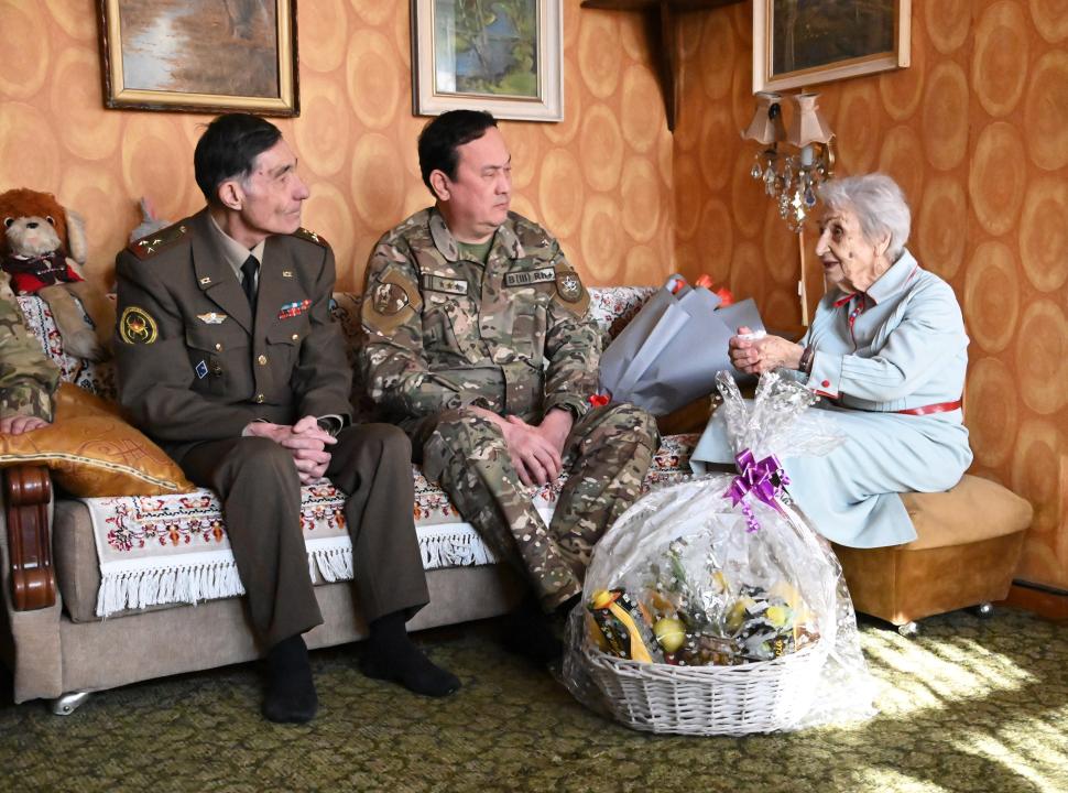 При встрече с 99-летним ветераном Великой Отечественной войны Анатолием Назаровичем Поповым полковник юстиции Тлеухан Басхожаев вручил фронтовику поздравительное письмо от имени министра обороны генерал-полковника Руслана Жаксылыкова.